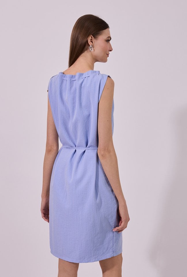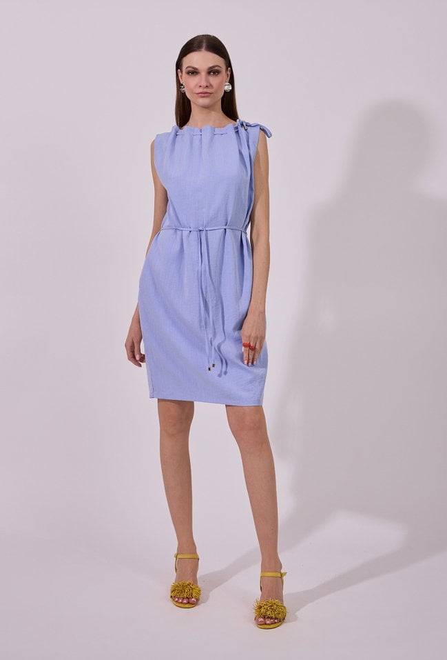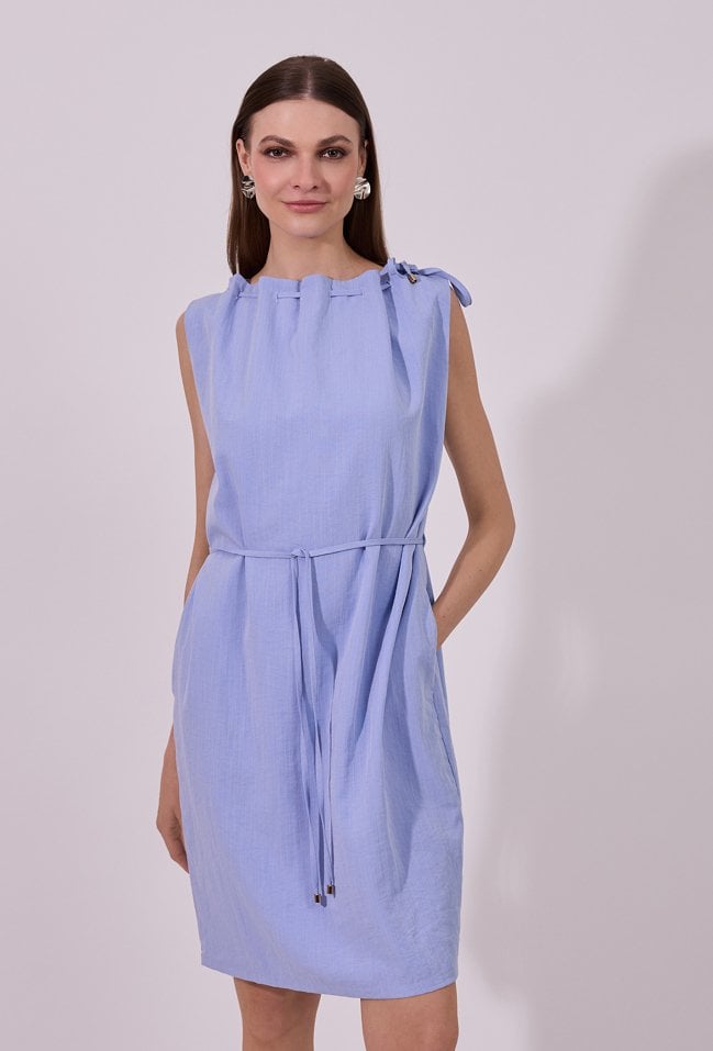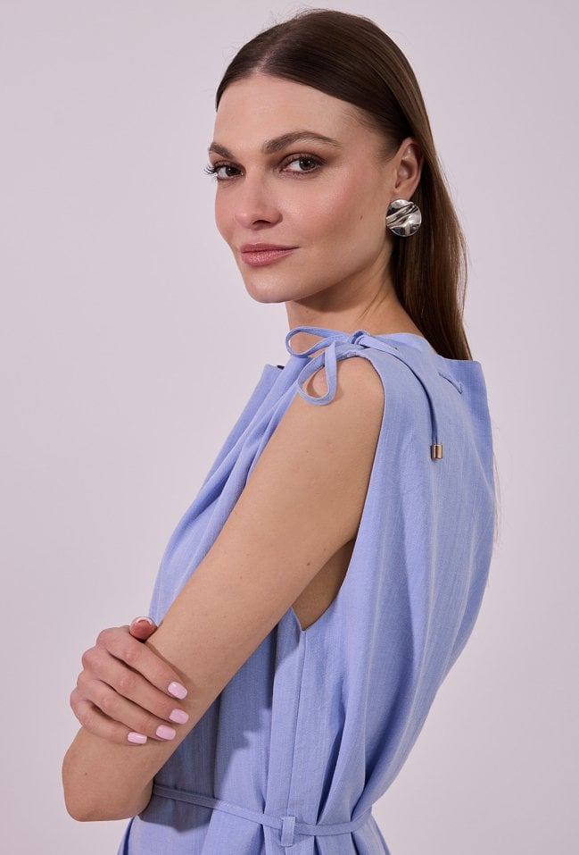 Sukienka damska o prostym, swobodnym kroju bez rękawów. Model z zabudowanym dekoltem oraz dekoracyjnymi troczkami przy szyi, które nadają całości nowoczesnego charakteru. W talii zastosowano wiązanie, pozwalające na podkreślenie sylwetki i indywidualne dopasowanie. Modelka na zdjęciu ma 177 cm wzrostu i prezentuje rozmiar 36.