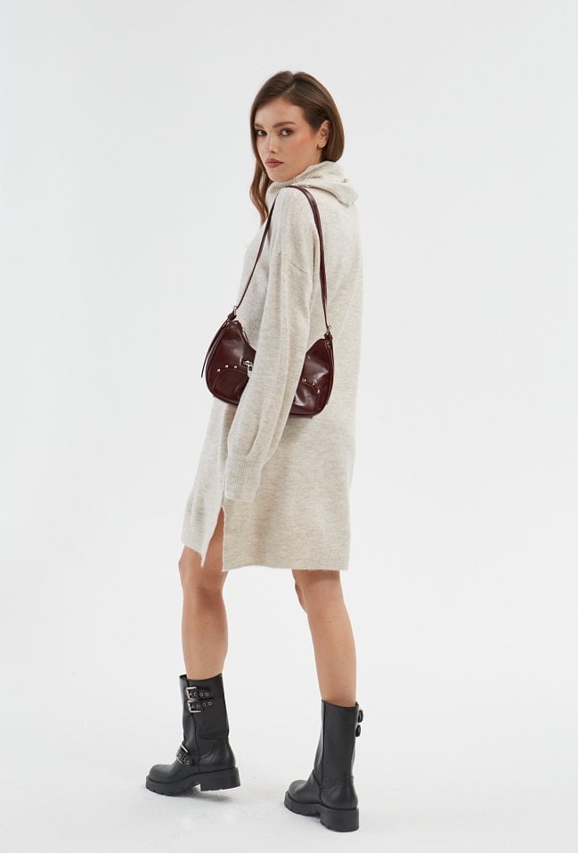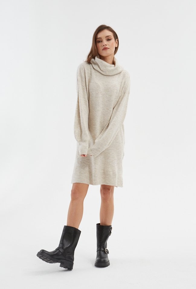 Beżowa sukienka z golfem wykonana z miękkiej i przyjemnej w dotyku dzianiny . Ma dopasowany fason z obszernym golfem. Długość przed kolna prezentuje się kobieco. Sukienka ma długie rękawy. Bedzie doskonałą propozycją na chłodne jesienne dni. Noś ją z kozakami lub szpilkami. Modelka na zdjęciu ma 175 cm wzrostu i prezentuje rozmiar 36.