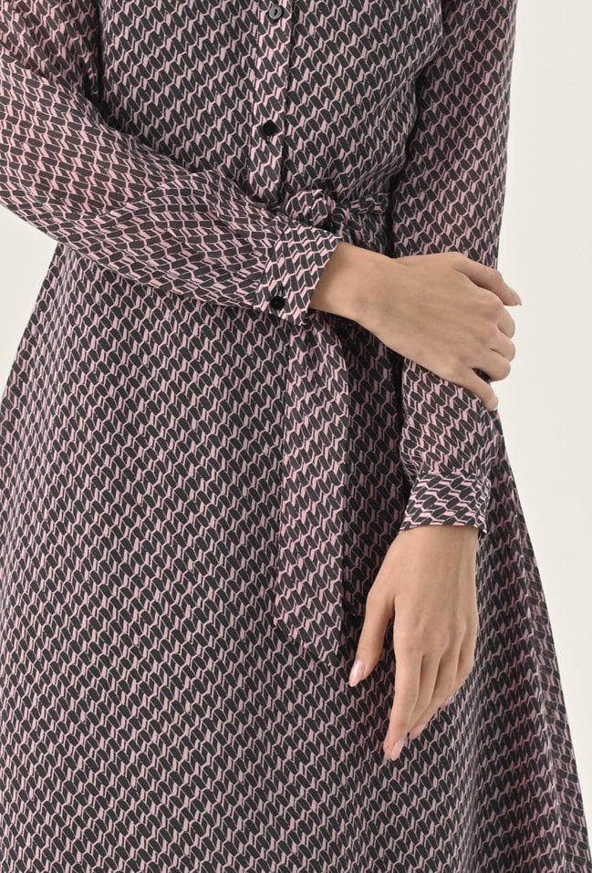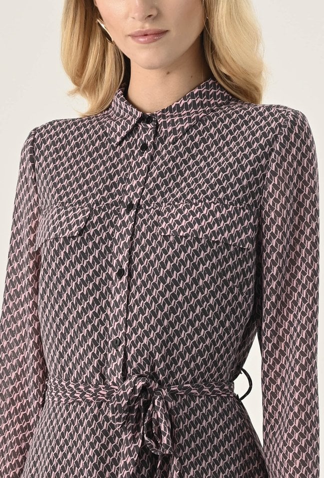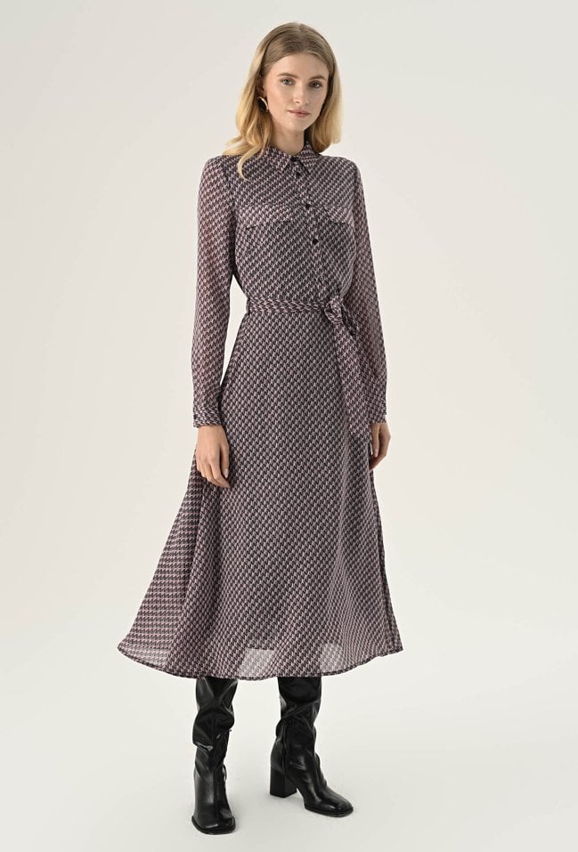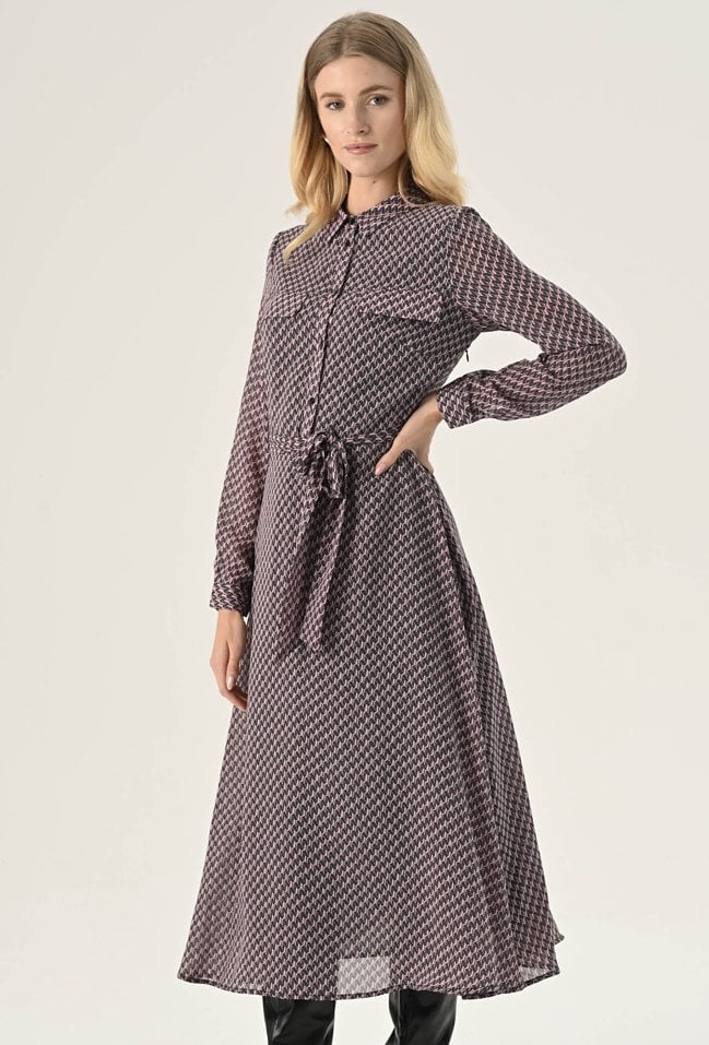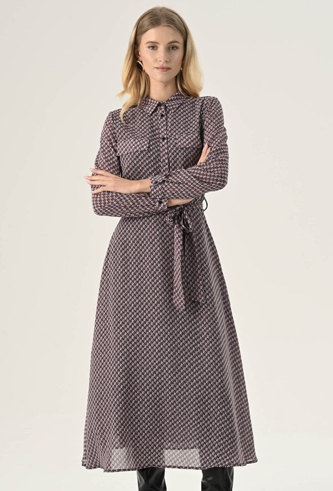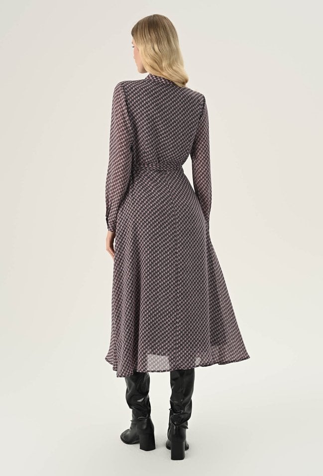Stylowa sukienka damska o kobiecym kroju, ozdobiona modnym geometrycznym wzorem. Model posiada praktyczne kieszenie oraz subtelny zamek kryty z boku, który zapewnia wygodne zakładanie i estetyczny wygląd. Talia została podkreślona paskiem, który pięknie modeluje sylwetkę. Idealna propozycja zarówno na co dzień, jak i na bardziej formalne okazje. Modelka na zdjęciu ma 174 cm wzrostu i nosi rozmiar 36/S.