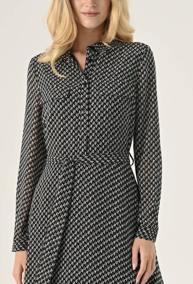 Stylowa sukienka damska o kobiecym kroju, ozdobiona modnym geometrycznym wzorem. Model posiada praktyczne kieszenie oraz subtelny zamek kryty z boku, który zapewnia wygodne zakładanie i estetyczny wygląd. Talia została podkreślona paskiem, który pięknie modeluje sylwetkę. Idealna propozycja zarówno na co dzień, jak i na bardziej formalne okazje. Modelka na zdjęciu ma 174 cm wzrostu i nosi rozmiar 36/S.