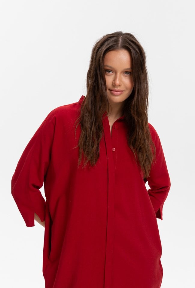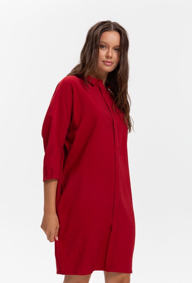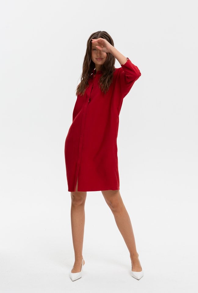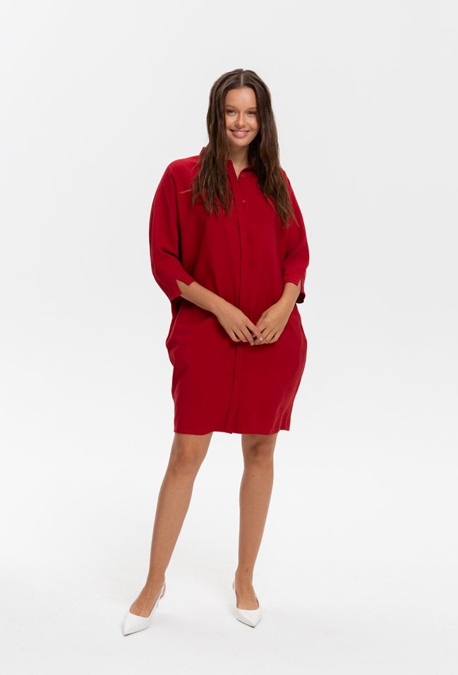 Sukienka damska w stylu koszulowym w kolorze niebieskim, z kołnierzem, zapinana na guziki z krytą plisą guzikową. Sukienka posiada prosty krój oraz nietoperzowe rękawy ¾ z delikatnym rozcięciem. Sukienka ma kieszenie po obydwu stronach. Sukienka jest idealną propozycją na lato, którą można nosić na co dzień.