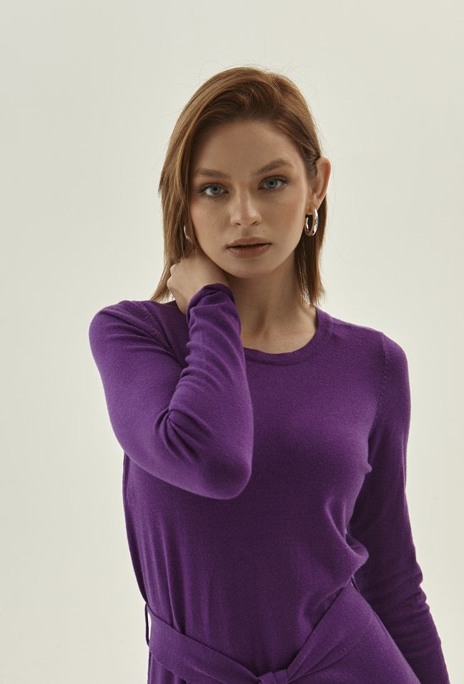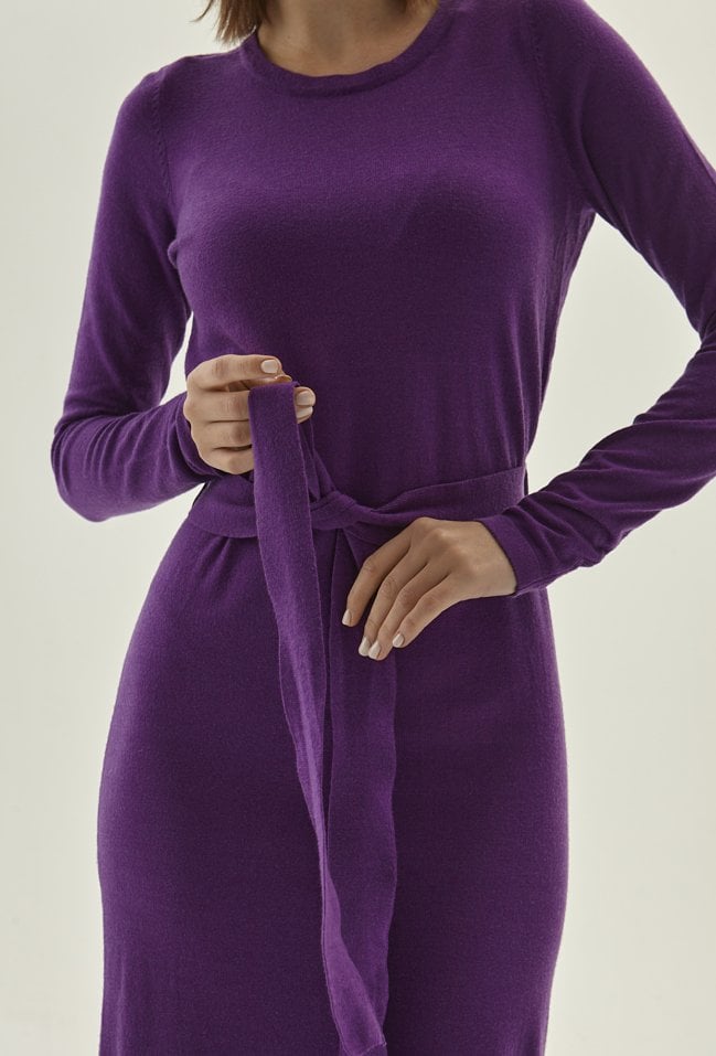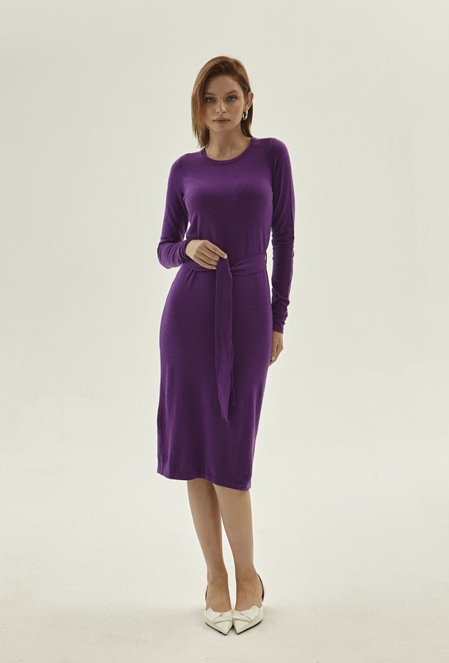 Fioletowa sukienka wykonana z przyjemnej w dotyku wiskozowej dzianiny. Długość poniżej kolan prezentuje się klasycznie. Wiązanie w tali piknie podkreśla sylwetkę. Sukienka ma długie rękawy i okrągły dekolt. Modelka na zdjęciu ma 178 cm wzrostu i prezentuje rozmiar 36.
