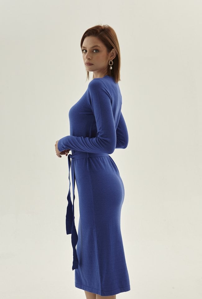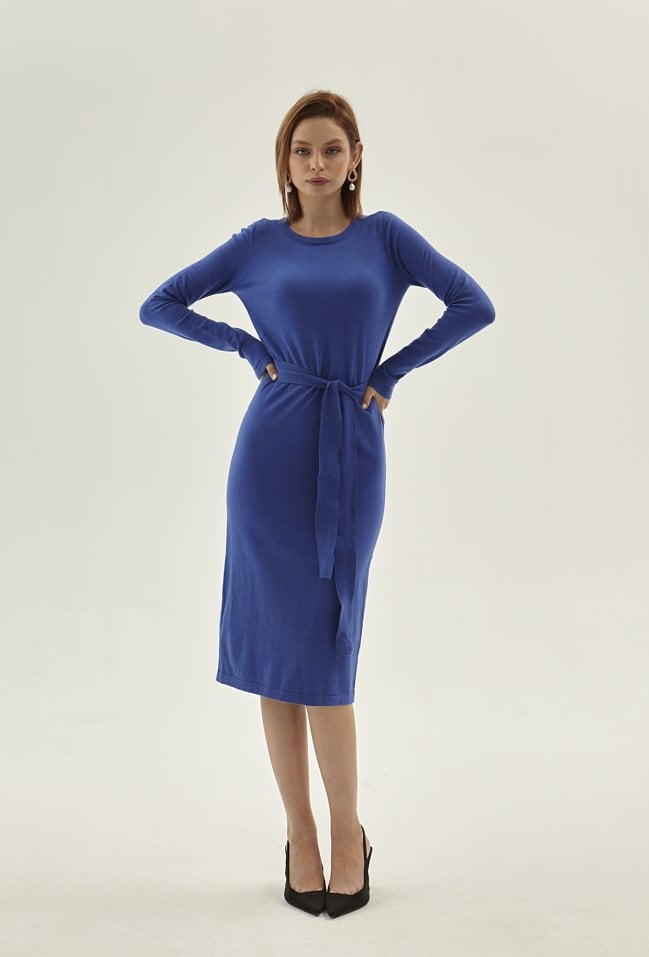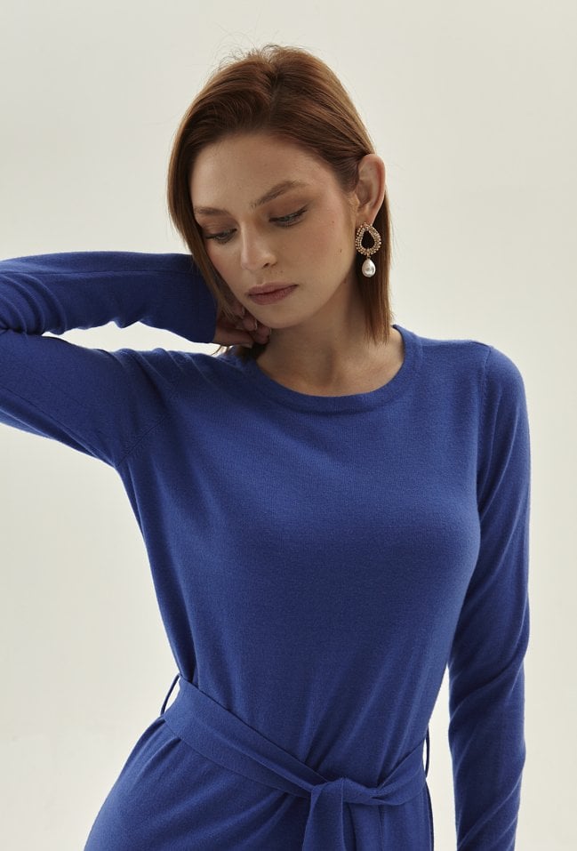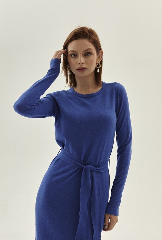 Niebieska sukienka wykonana z przyjemnej w dotyku wiskozowej dzianiny. Długość poniżej kolan prezentuje się klasycznie. Wiązanie w tali piknie podkreśla sylwetkę. Sukienka ma długie rękawy i okrągły dekolt. Modelka na zdjęciu ma 178 cm wzrostu i prezentuje rozmiar 36.