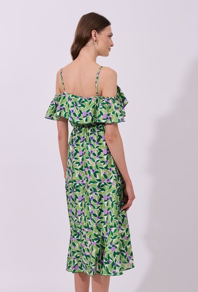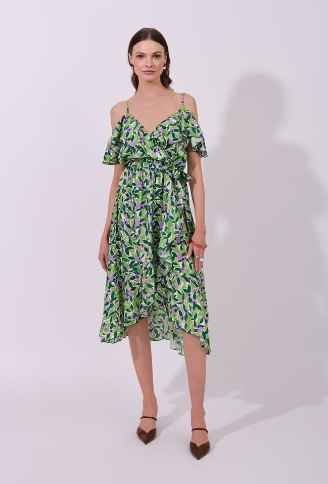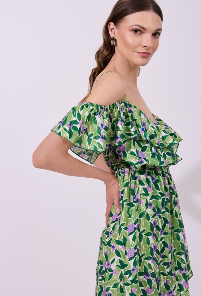Sukienka damska o zwiewnym, rozkloszowanym kroju midi. Model z dekoltem w kształcie litery V oraz cienkimi ramiączkami, uzupełniony efektownymi, opadającymi rękawkami typu hiszpanka, które nadają całości romantycznego charakteru. W talii zastosowano wiązanie, podkreślające sylwetkę i zapewniające dobre dopasowanie. Modelka na zdjęciu ma 177 cm wzrostu i prezentuje rozmiar 36.