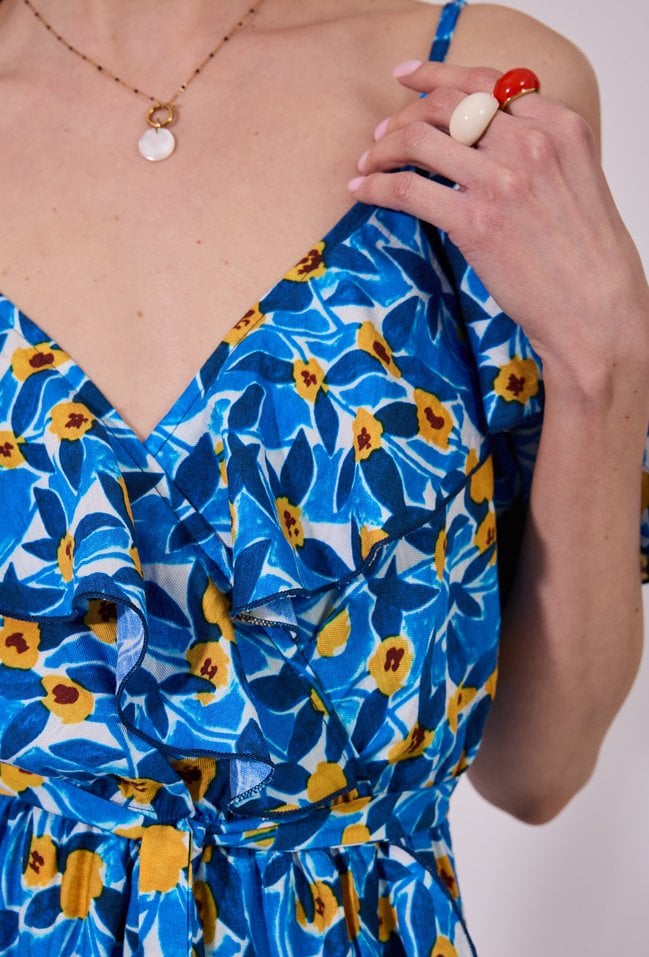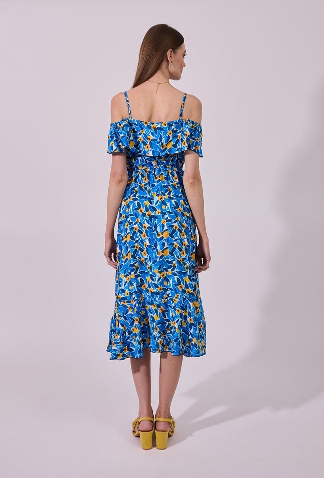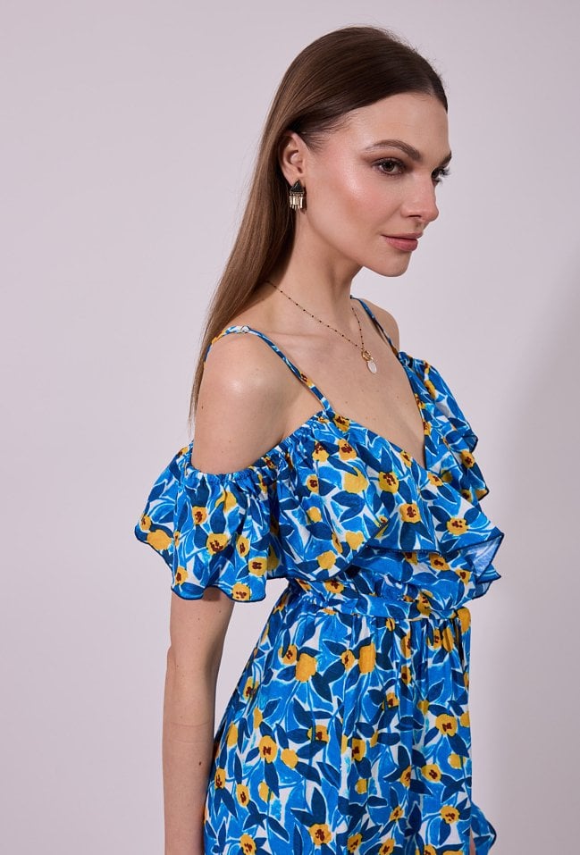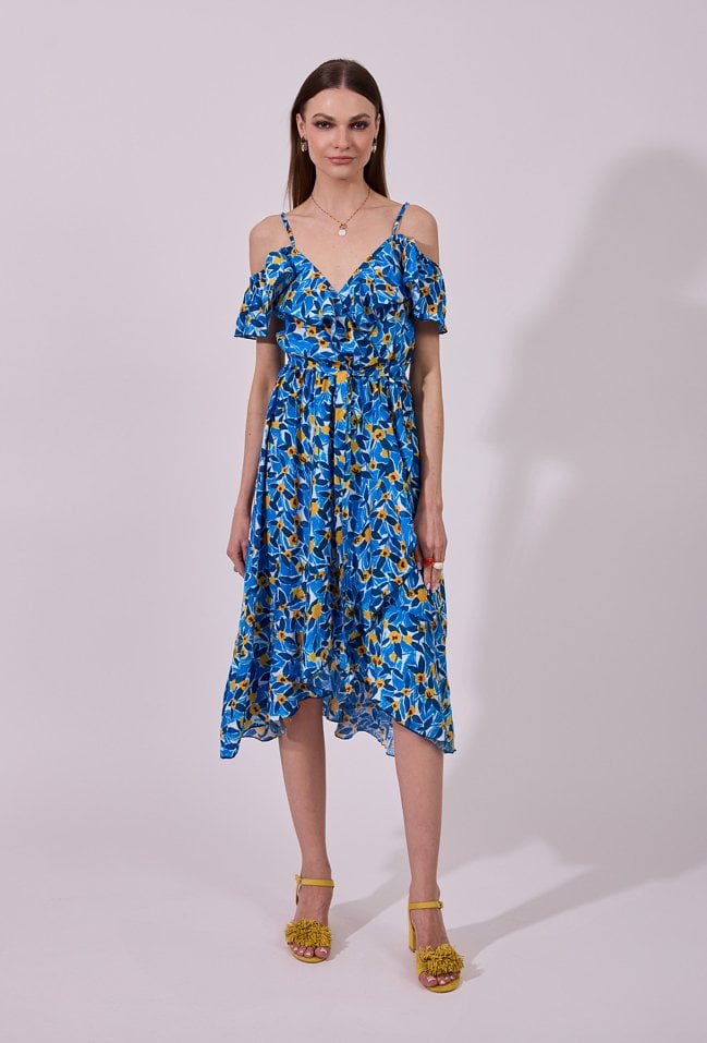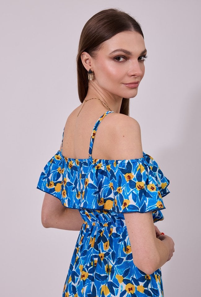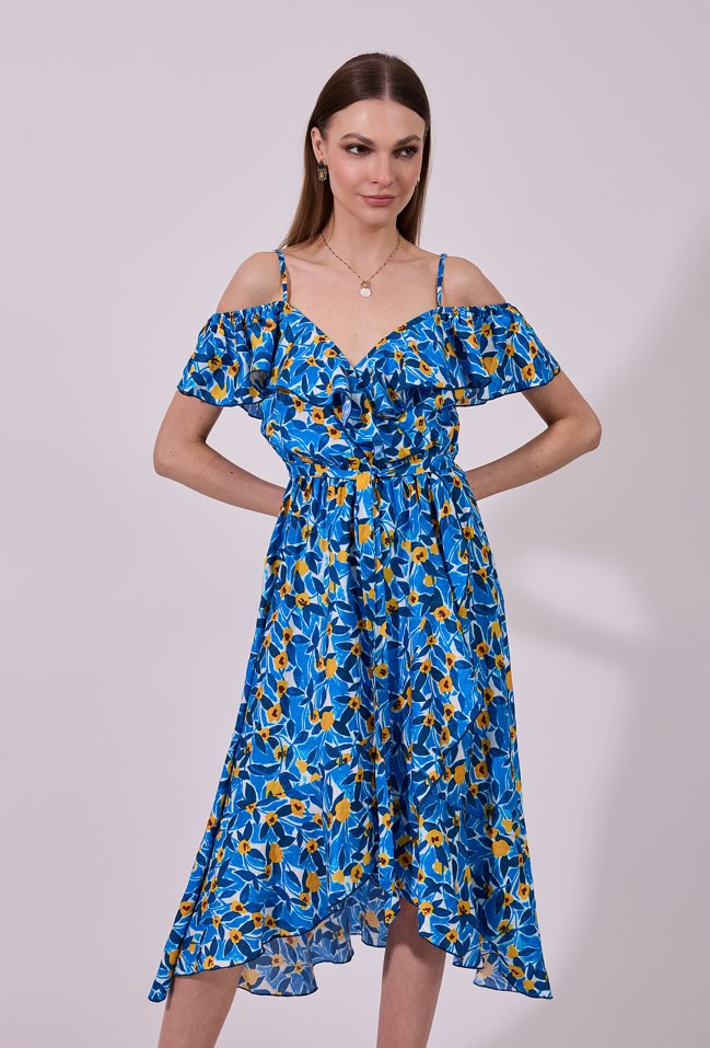 Sukienka damska o zwiewnym, rozkloszowanym kroju midi. Model z dekoltem w kształcie litery V oraz cienkimi ramiączkami, uzupełniony efektownymi, opadającymi rękawkami typu hiszpanka, które nadają całości romantycznego charakteru. W talii zastosowano wiązanie, podkreślające sylwetkę i zapewniające dobre dopasowanie. Modelka na zdjęciu ma 177 cm wzrostu i prezentuje rozmiar 36.