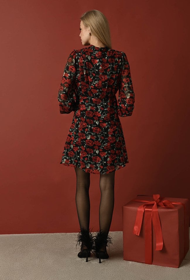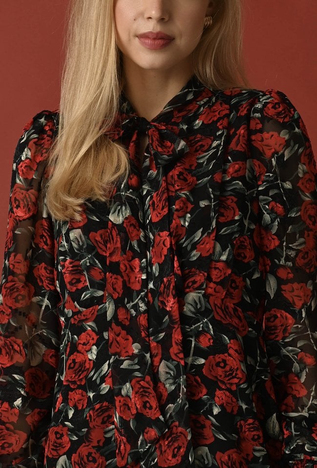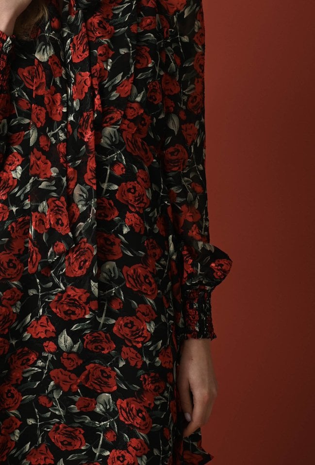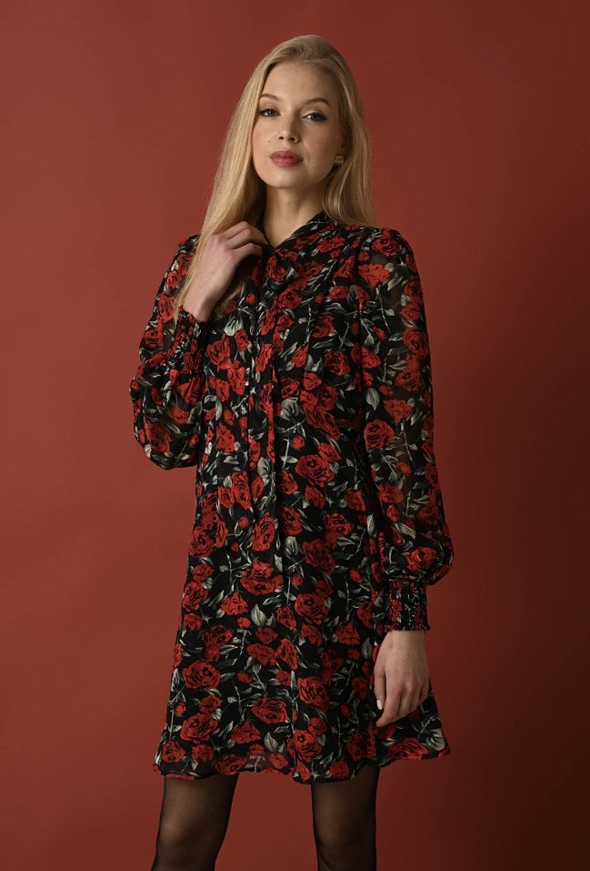 Niezwykle kobieca sukienka w piękny print czerwonych róż, wykonana ze zwiewnej tkaniny. Posiada szarfę przy dekolcie, która dodaje jej klasy i elegancji. Długie rękawy zakończone są szerokimi mankietami, nadając im delikatnej bufki. Sukienka posiada podszewkę. To model z efektem „wow”, który doskonale sprawdzi się podczas wieczorowych wyjść oraz świątecznych uroczystości rodzinnych. Modelka ma 177 cm wzrostu i prezentuje rozmiar 36.