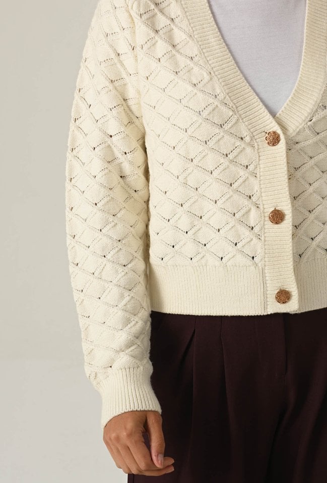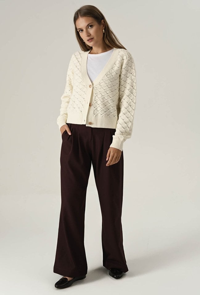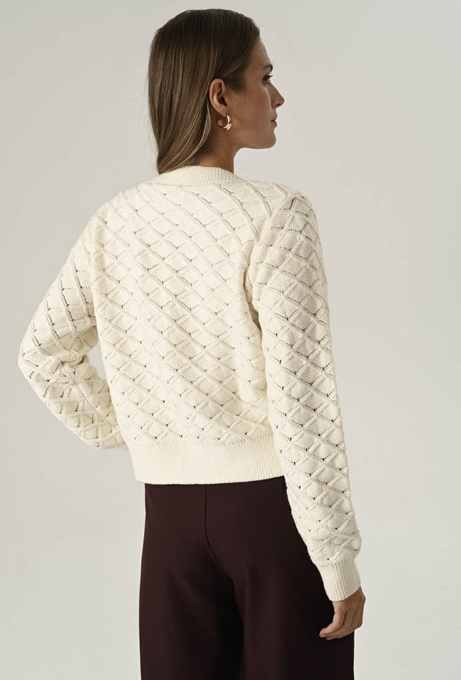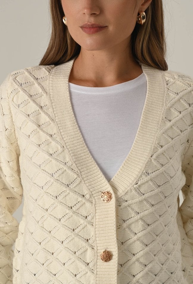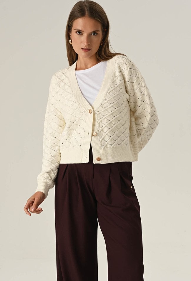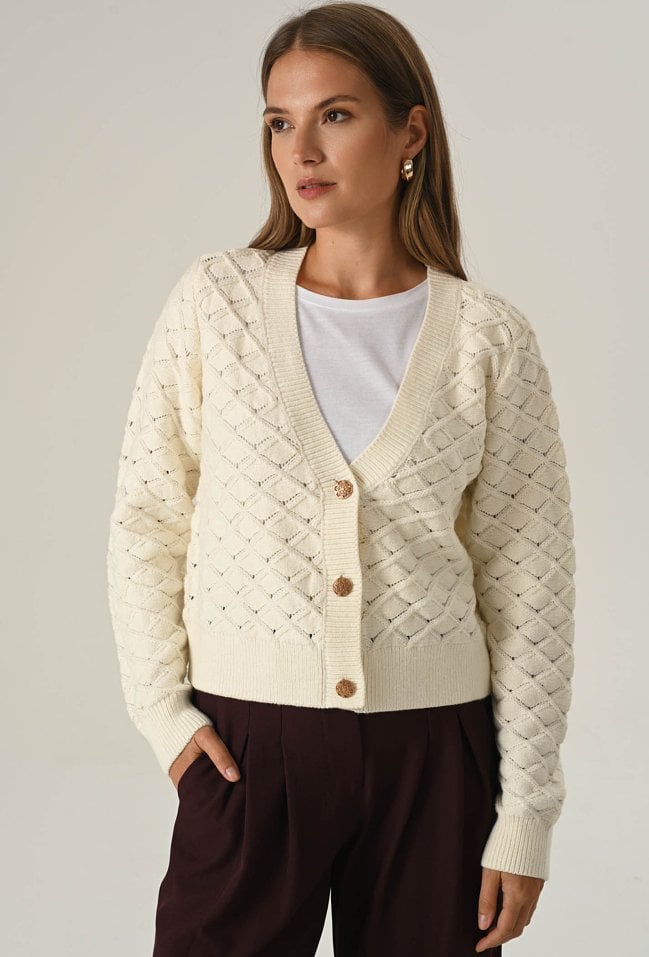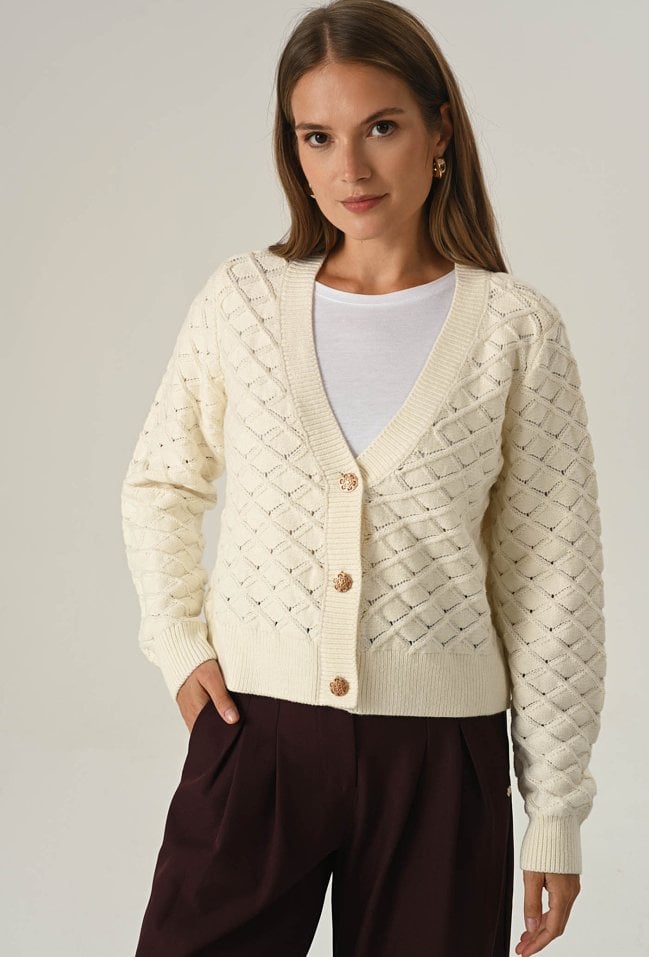 Efektowny kardigan wykonany z wysokiej jakości bawełnianej przędzy o ażurowym splocie. Miękki i przyjemny w dotyku materiał zapewnia komfort noszenia, a dekoracyjny wzór dodaje stylizacji lekkości i kobiecego uroku. Idealny jako uzupełnienie letnich sukienek, topów czy koszul. Sprawdzi się zarówno na co dzień, jak i podczas wyjątkowych okazji. Modelka na zdjęciu ma 177 cm wzrostu i prezentuje rozmiar 36/S.
