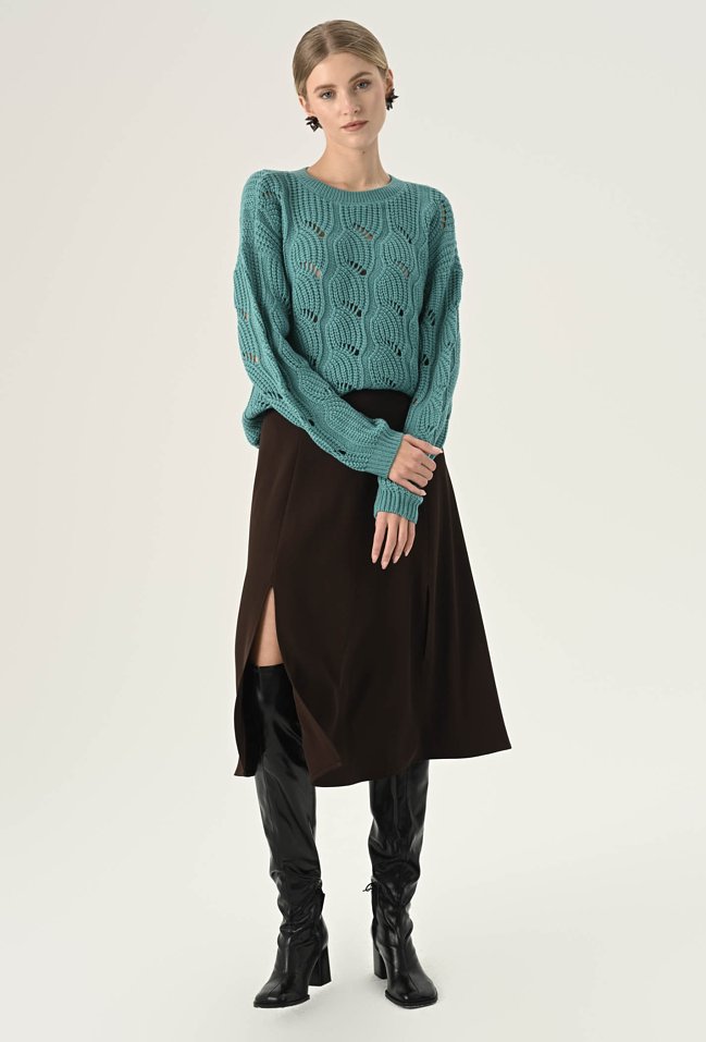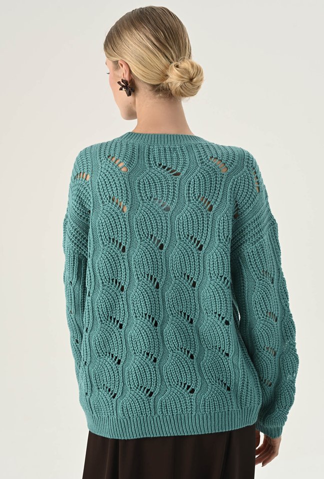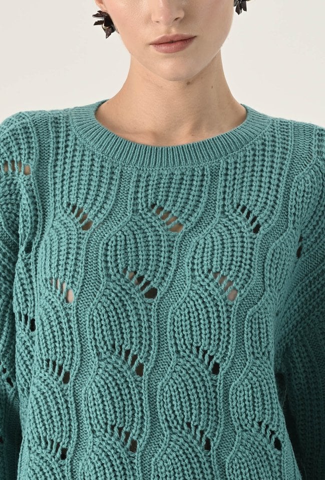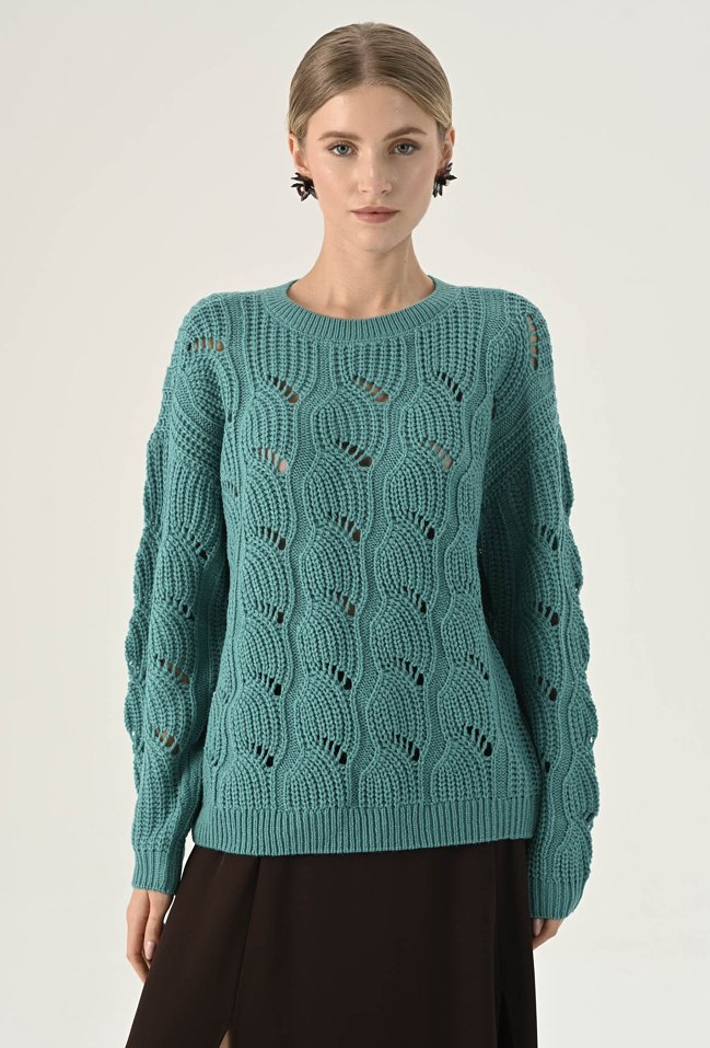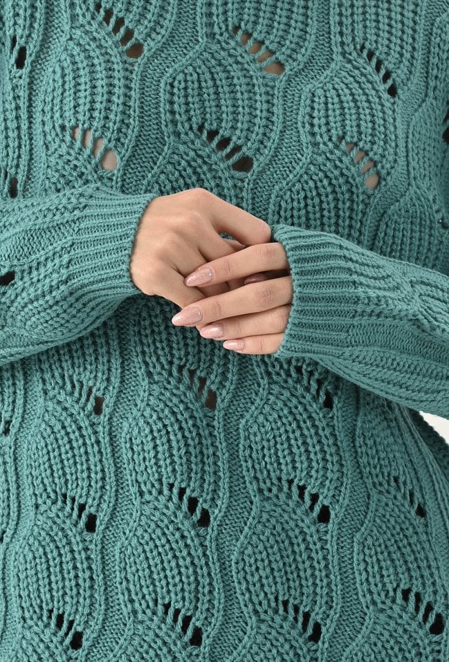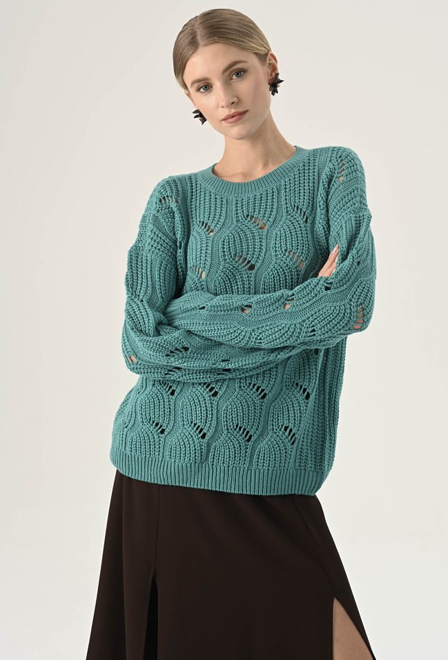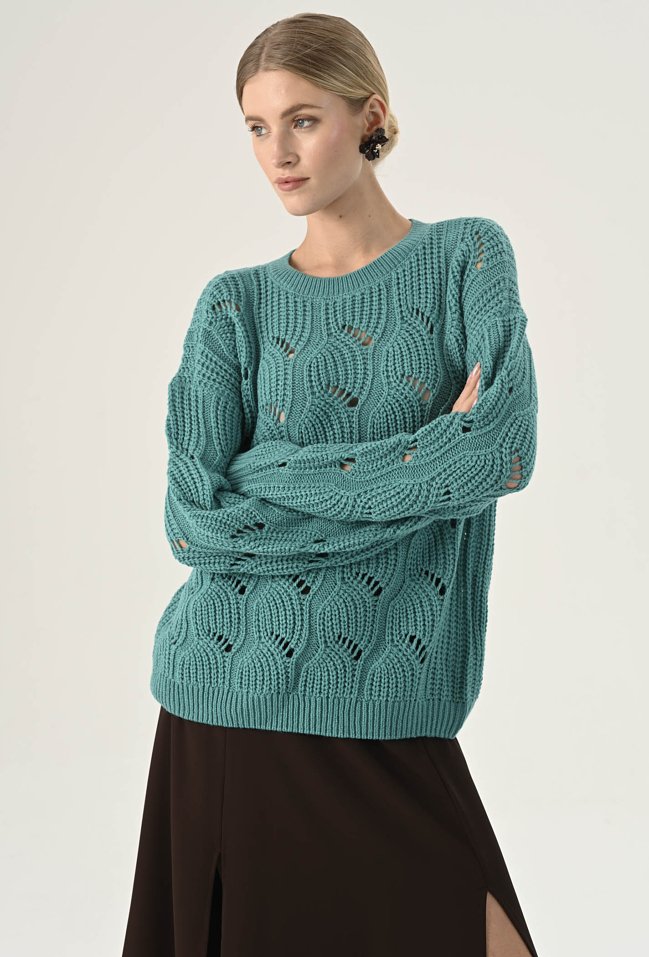Sweter o prostym kroju wykonany z delikatnej, ażurowej dzianiny, to doskonały sposób na optyczne rozświetlenie Twoich jesiennych stylizacji, szlachetny szmaragd pięknie prezentuje się w towarzystwie różnych typów urody, a ażurowa dzianina dodaje niezwykłej lekkości. Sweter został wykonany z bawełnianej przędzy. Modelka na zdjęciu ma 177 cm wzrostu i prezentuje rozmiar 36.
