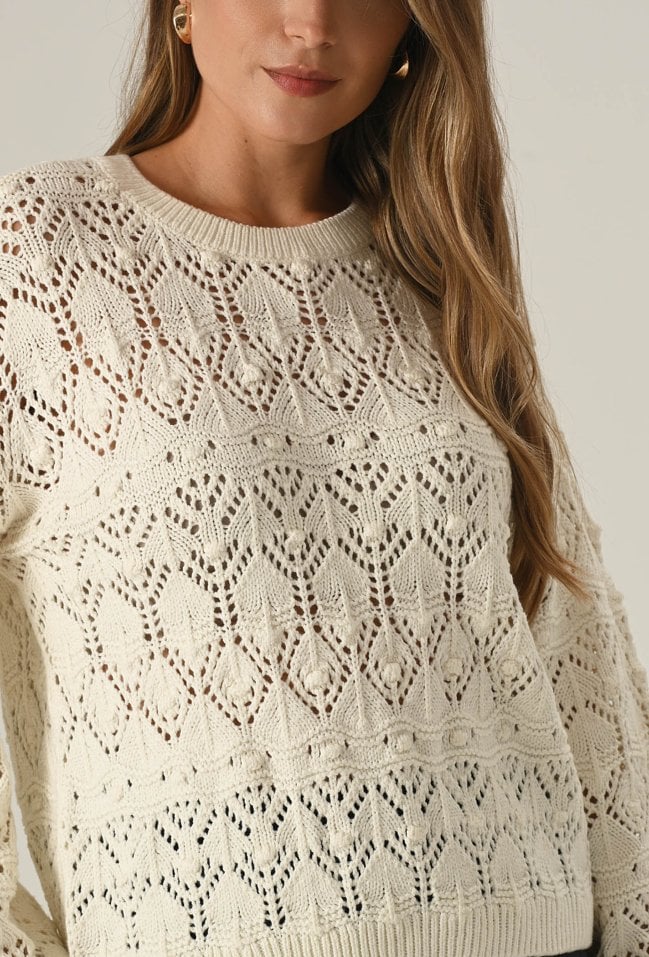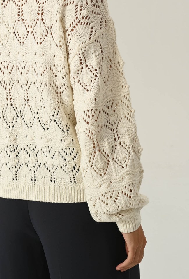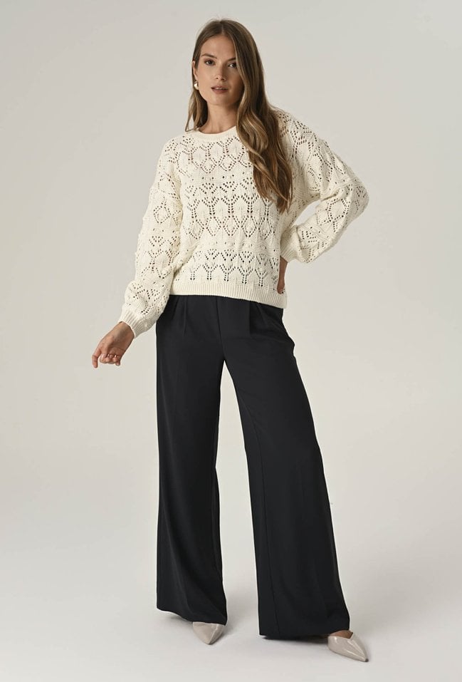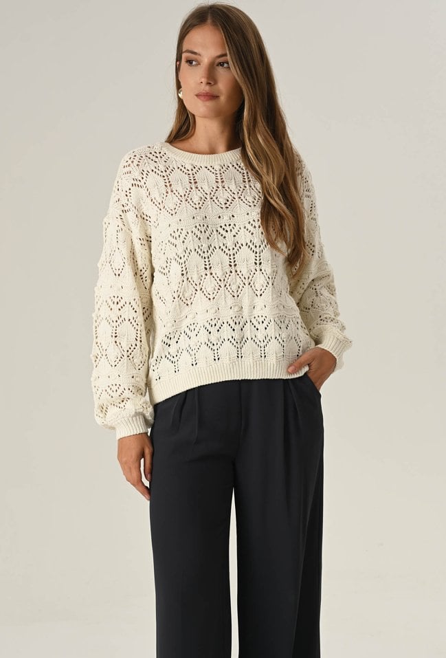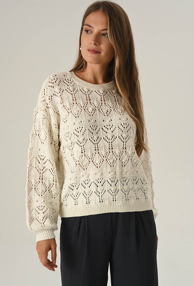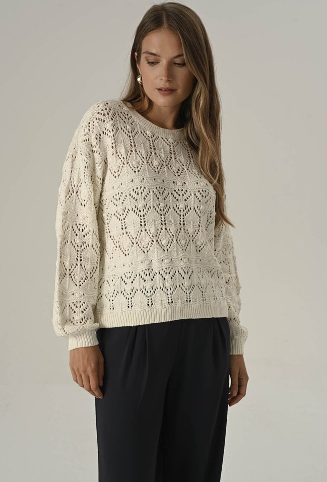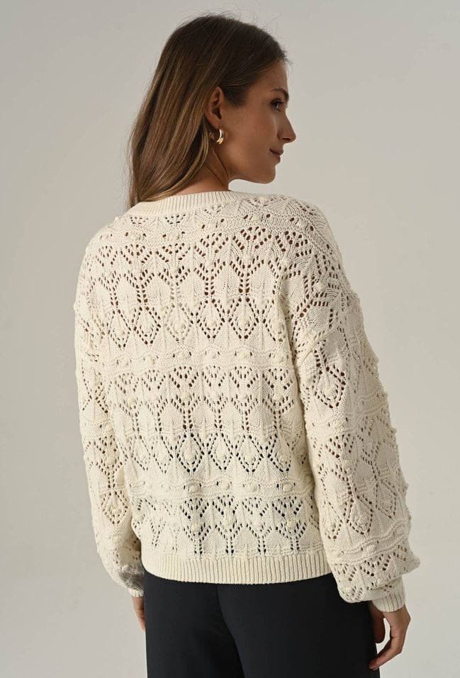 Efektowny, ażurowy sweter wykonany z naturalnej, przyjemnej w dotyku bawełnianej przędzy. Delikatny, dekoracyjny splot nadaje mu kobiecego uroku i subtelności, a przewiewna struktura sprawia, że idealnie sprawdzi się zarówno w cieplejsze dni, jak i jako warstwa pod marynarkę czy kurtkę. To doskonały wybór dla kobiet ceniących styl, komfort i jakość. Modelka na zdjęciu ma 177 cm wzrostu i prezentuje rozmiar 36/S.