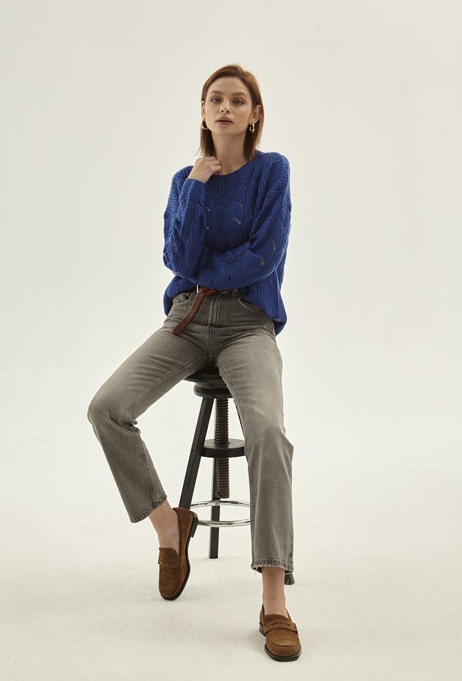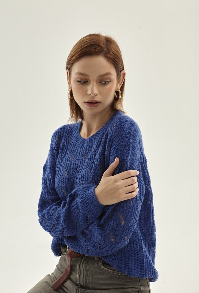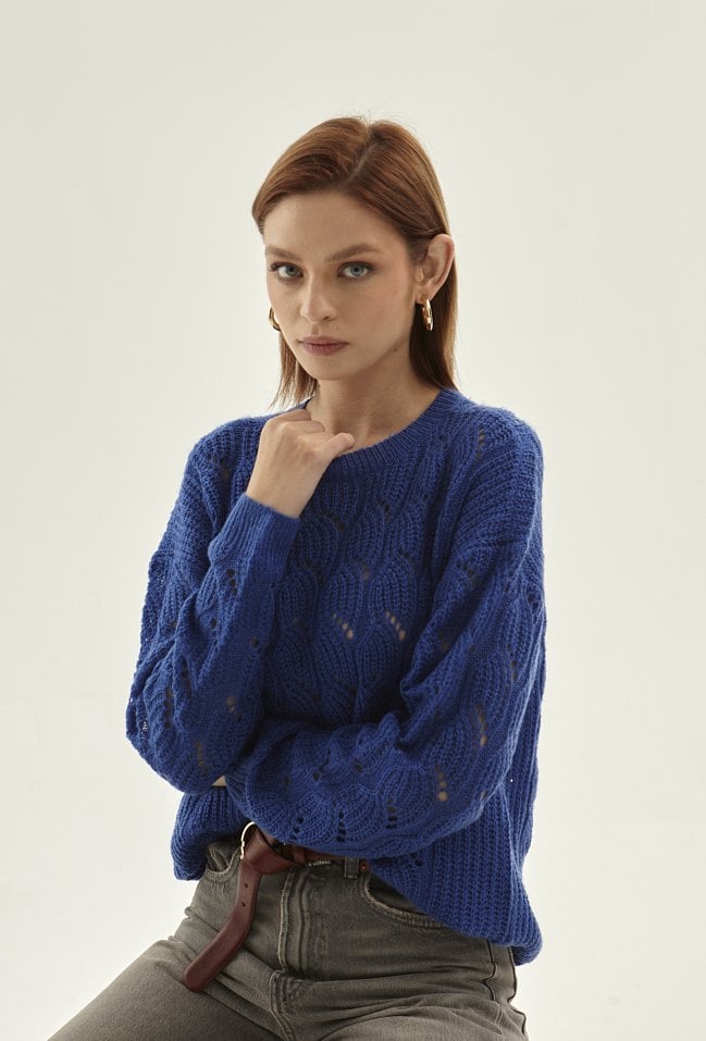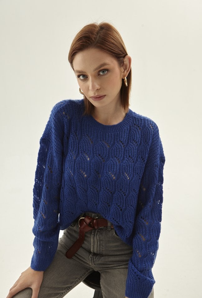 Sweter o ażurowej strukturze z długimi rękawami zakończonymi ściągaczem. Wyrazisty kolor doda charakteru każdej stylizacji. Sweter ma wygodny, luźny krój. Sweter możesz nosić na różne casualowe okazje – sprawdzi się zarówno w chłodne letnie wieczory, jak i wczesną jesienią. Modelka na zdjęciu ma 175 cm wzrostu i prezentuje rozmiar 36.