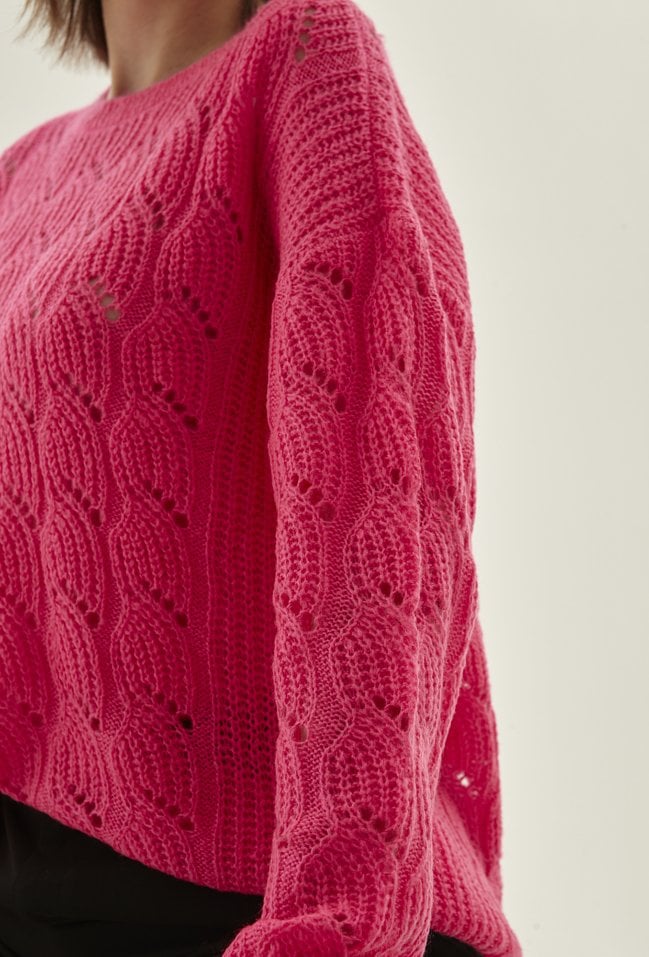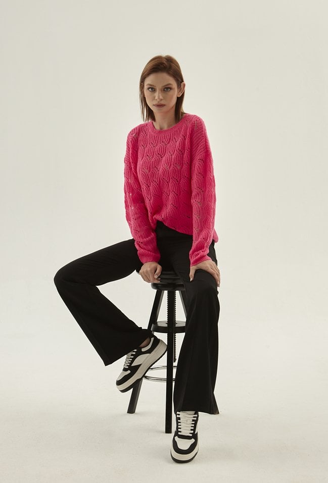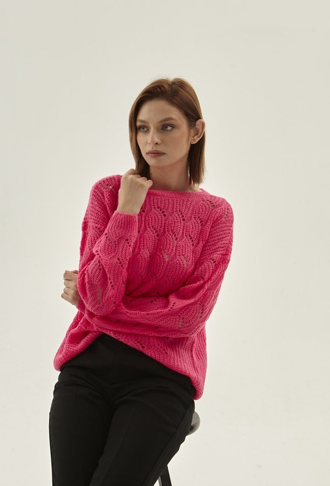 Sweter o ażurowej strukturze z długimi rękawami zakończonymi ściągaczem. Wyrazisty kolor doda charakteru każdej stylizacji. Sweter ma wygodny, luźny krój. Sweter możesz nosić na różne casualowe okazje – sprawdzi się zarówno w chłodne letnie wieczory, jak i wczesną jesienią. Modelka na zdjęciu ma 175 cm wzrostu i prezentuje rozmiar 36.