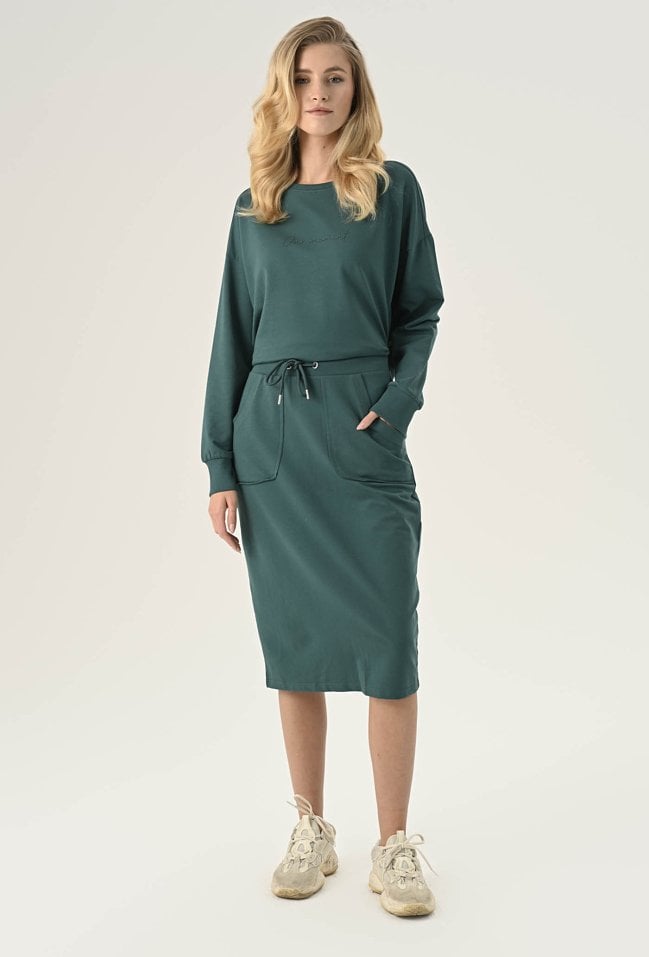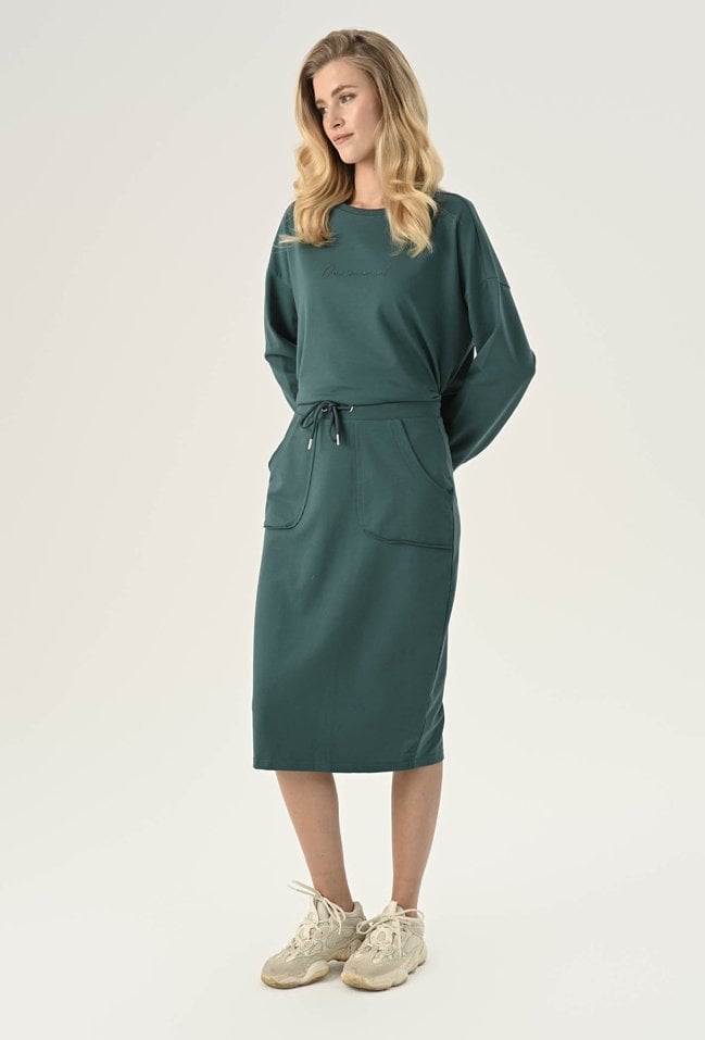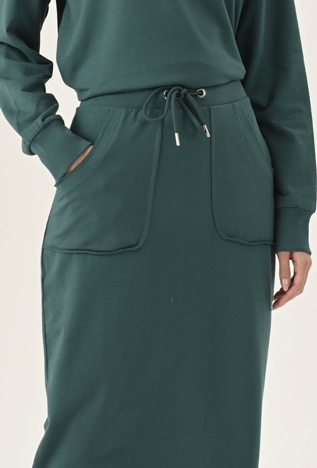 Bawełniana, wygodna spódnica midi to idealna propozycja dla kobiet ceniących sobie wygodę i styl. Elastyczna guma w pasie gwarantuje idealne dopasowanie do Twojej sylwetki, a kieszenie dodają funkcjonalności. Wykonana z przyjemnej, bawełnianej dzianiny zapewni Ci komfort noszenia przez cały dzień, a surowe wykończenie nadaje modowego charakteru. Spódnica świetnie sprawdzi się w codziennych stylizacjach. Modelka na zdjęciu ma 177 cm wzrostu i prezentuje rozmiar 36.