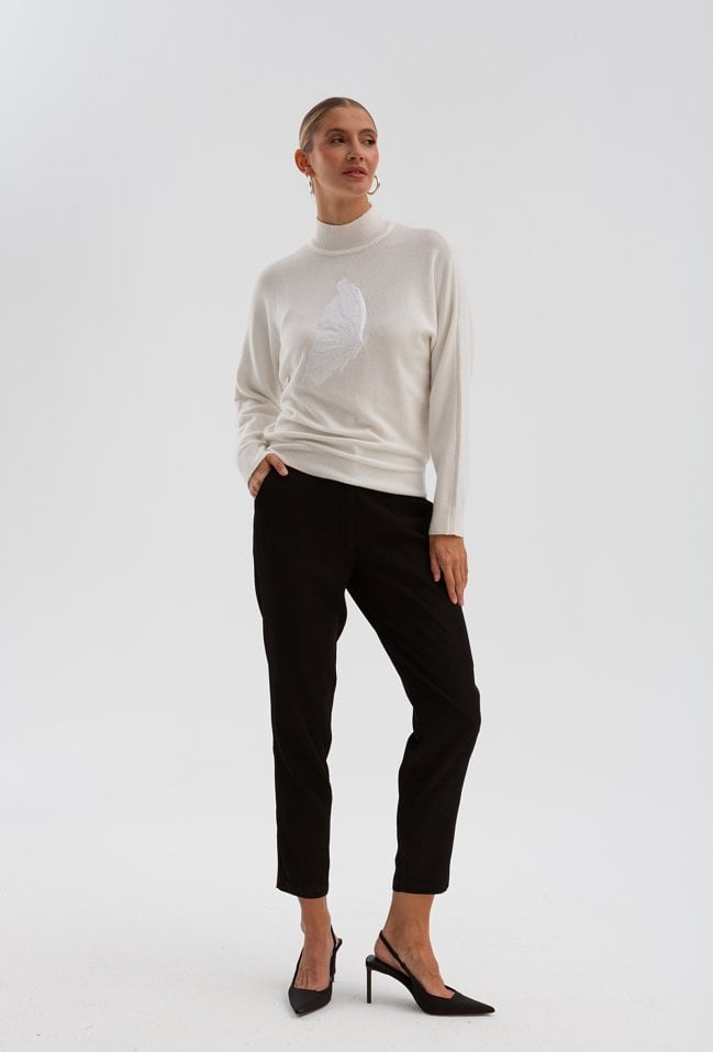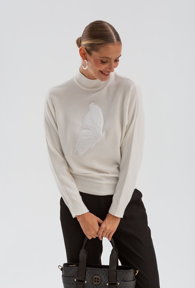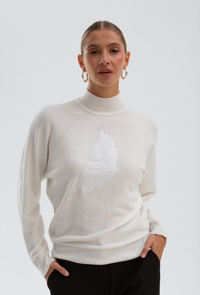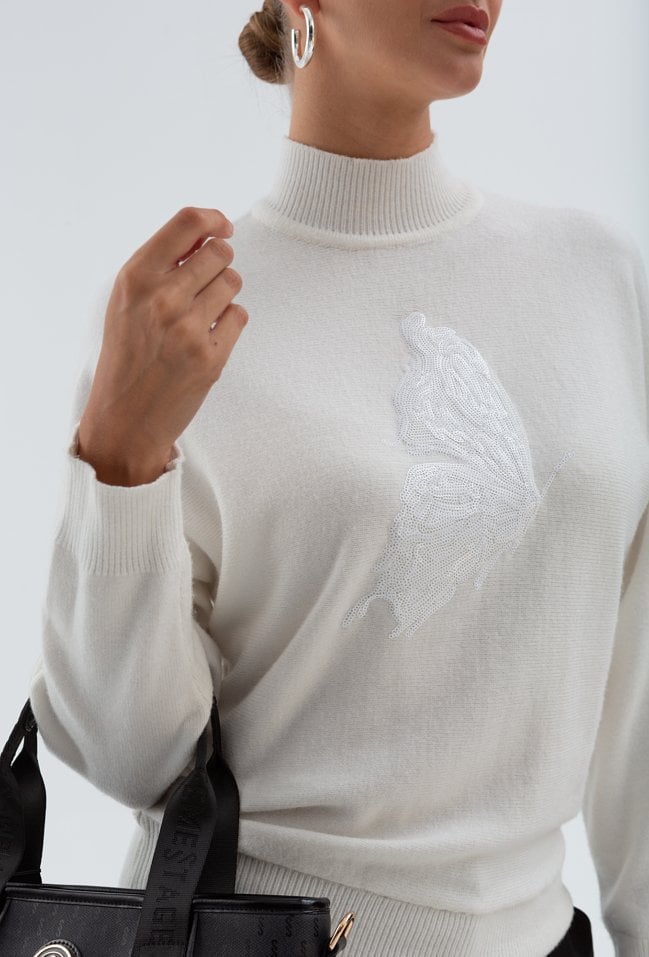 Biały sweter wykonany z przyjemnej w dotyku dzianiny z domieszką wiskozy. Posiada długie rękawy zakończone ściągaczem. Uroku dodaje mu cekinowa aplikacja w tym samym kolorze. Model ten z pewnością świetnie sprawdzi się w zestawie z czarnymi spodniami. Modelka na zdjęciu ma 180 cm wzrostu i prezentuje rozmiar 36.