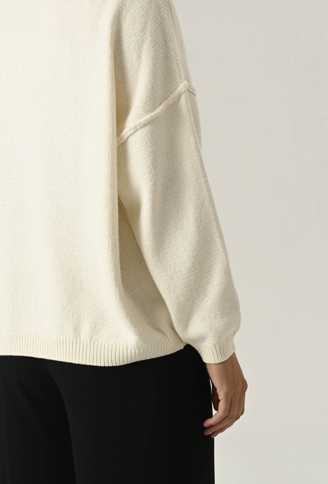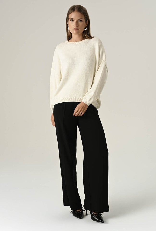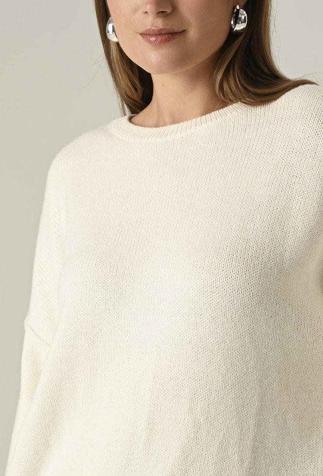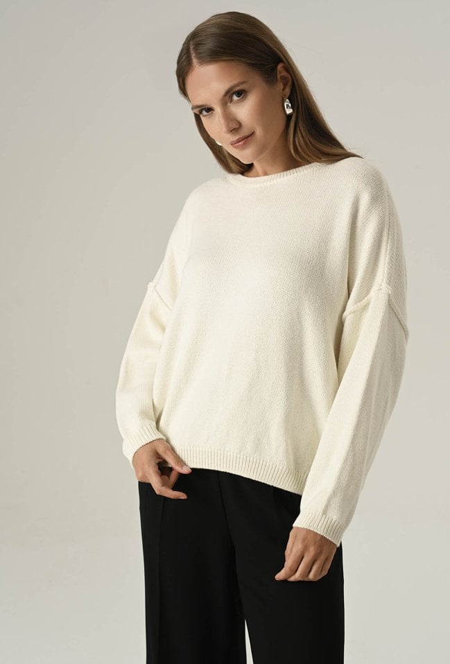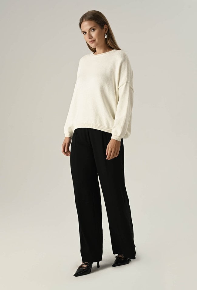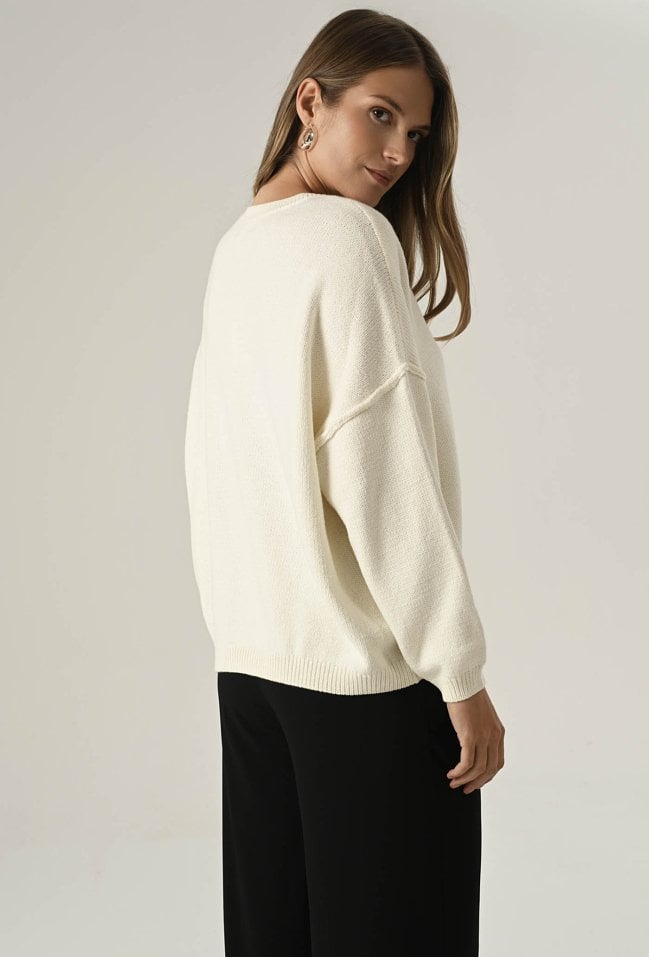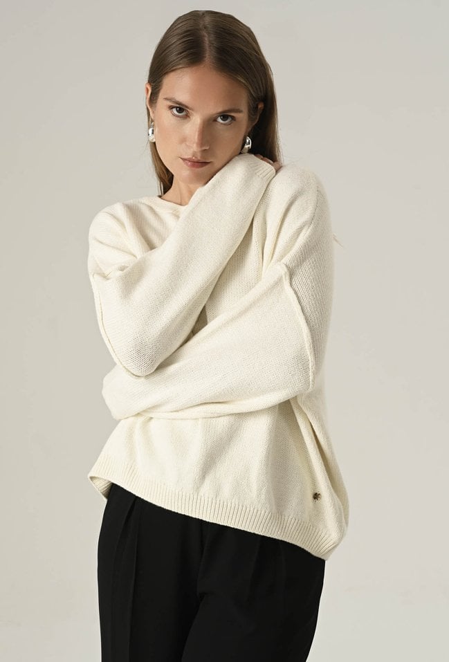 Ponadczasowy sweter o klasycznym kroju z delikatnie opuszczoną linią ramion, wykonany z miękkiej przędzy z dodatkiem bawełny. Komfortowy, przyjemny w dotyku materiał świetnie sprawdza się w codziennym użytkowaniu, zapewniając wygodę i swobodę ruchów. Minimalistyczny design sprawia, że to idealna baza do wielu stylizacji – od casualowych po bardziej eleganckie. Modelka na zdjęciu ma 177 cm wzrostu i prezentuje rozmiar 36/S.