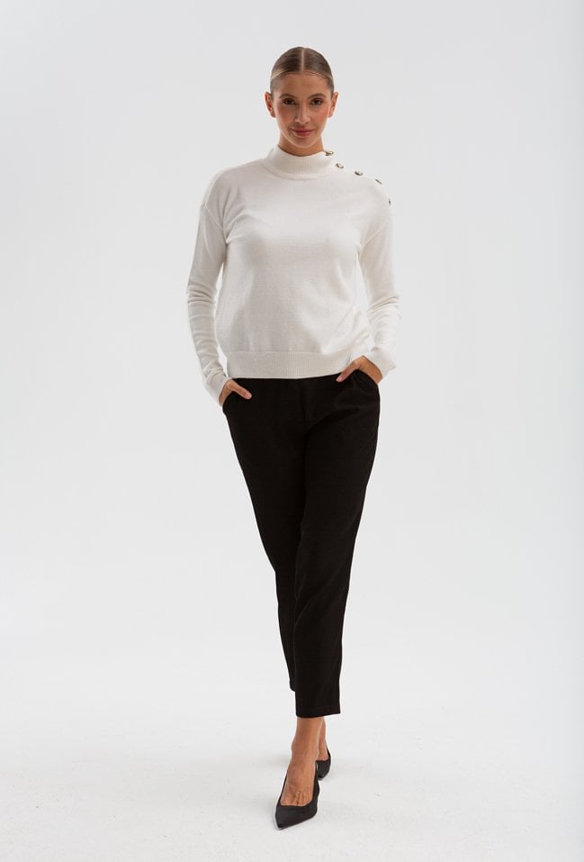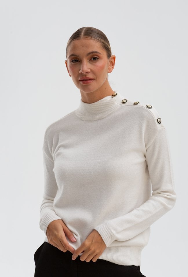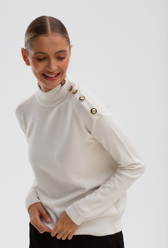 Biały sweter z miękkiej dzianiny z domieszką wiskozy. Długie rękawy zakończone ściągaczem, półgolf. Na ramieniu znajdują się ozdobne guziki, które nadają mu szlachetności. Świetnie sprawdzi na wyjątkowe okazje ale też do codziennych wyjść. Modelka na zdjęciu ma 180 cm wzrostu i prezentuje rozmiar 36.