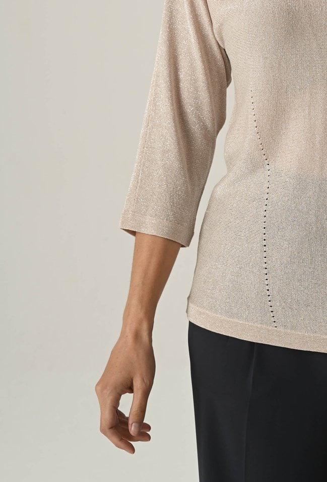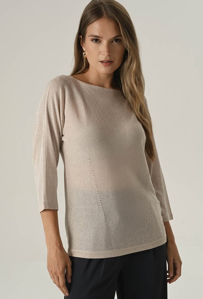 Miękki i wygodny, a przy tym z nutą elegancji – ten sweter z dekoltem w łódkę i rękawem 3/4 świetnie sprawdzi się na co dzień i na spotkania. Dzianina z przewagą wiskozy jest przyjemna dla skóry, a delikatna metaliczna nić dodaje mu wyjątkowego charakteru. Prosty fason, który z łatwością dopasujesz do jeansów, spódnicy lub eleganckich spodni. Modelka na zdjęciu ma 177 cm wzrostu i prezentuje rozmiar 36/S.