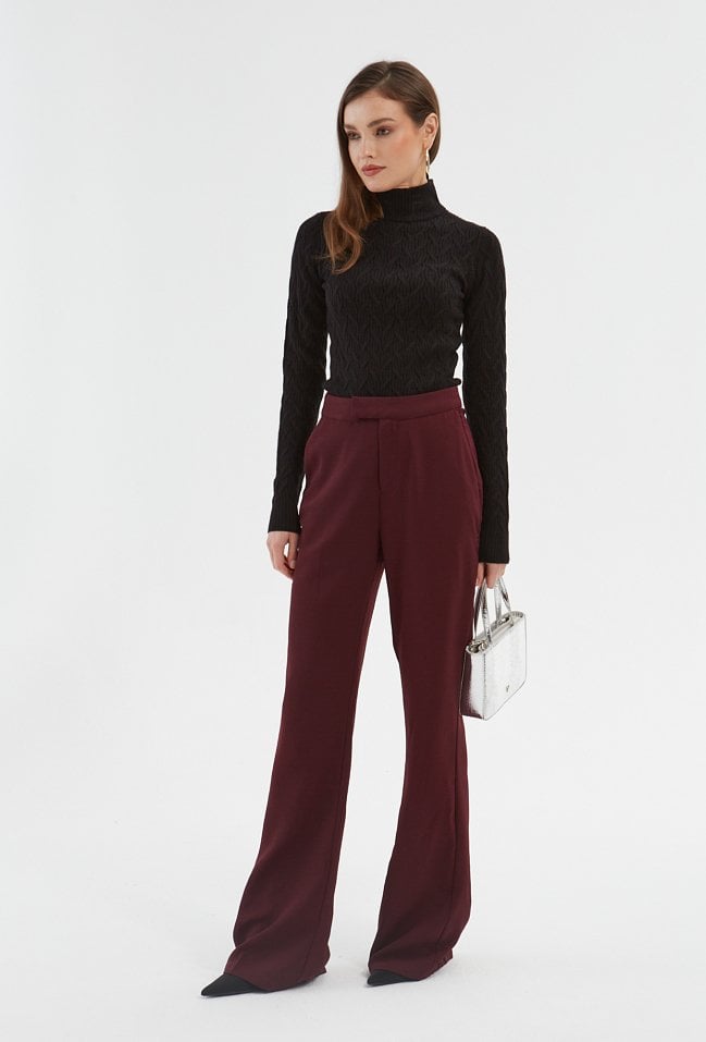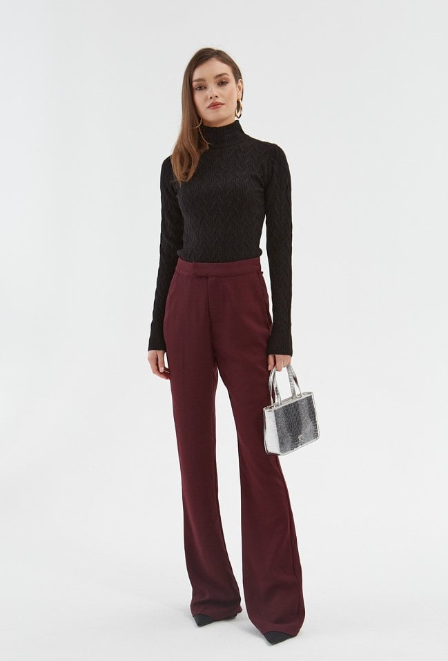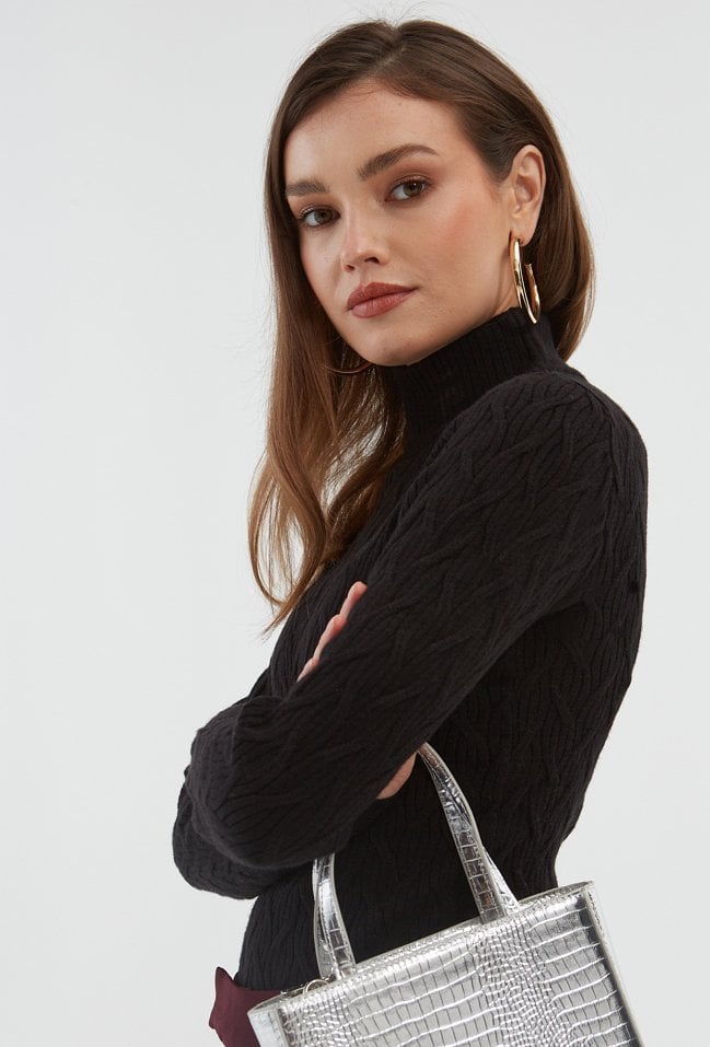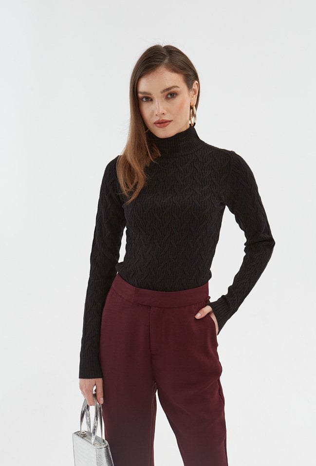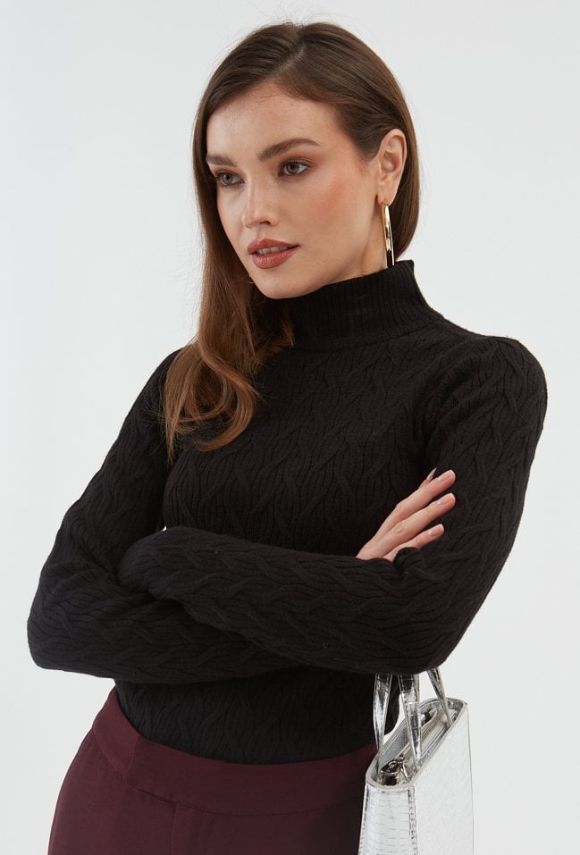Golf w czarnym kolorze wykonany z przyjemnej w dotyku i idealnej na jesienną porę wiskozowej dzianiny. Ma dopasowany fason z długimi rękawami i golfem, uroku dodaję mu ozdobny warkoczowy splot. Sweter będzie dobrą podstawą sezonowej garderoby – pasuje zarówno do jeansowych spodni, jak i do ołówkowych spódnic czy cygaretek w różnych kolorach. Modelka na zdjęciu ma 172 cm wzrostu i prezentuje rozmiar 36.