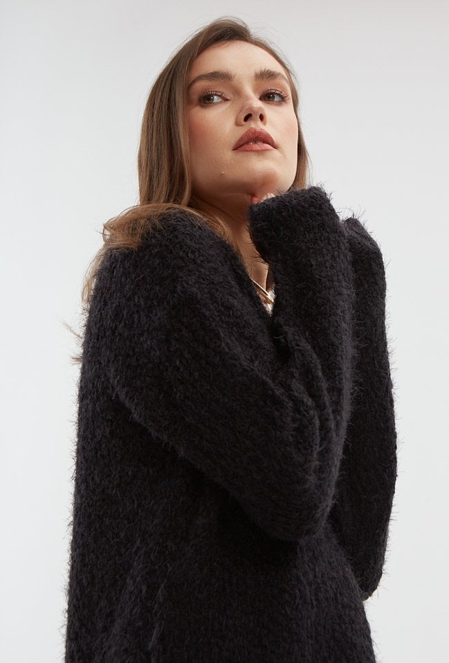 Czarny sweter z miękkiej przędzy bouclé. Ten model będzie nas ogrzewał całą jesień. Ma luźny fason , długie rękawy z obniżoną linią ramion oraz głęboki dekolt w v-nek. Bardzo mięciutka i przyjemna dzianina, sprawi, że będziemy czuć się bardzo komfortowo. Ten model będzie doskonałym uzupełnieniem jesiennej garderoby a do tego jest bardzo wygodny. Modelka na zdjęciu ma 171 cm wzrostu i prezentuje rozmiar S.