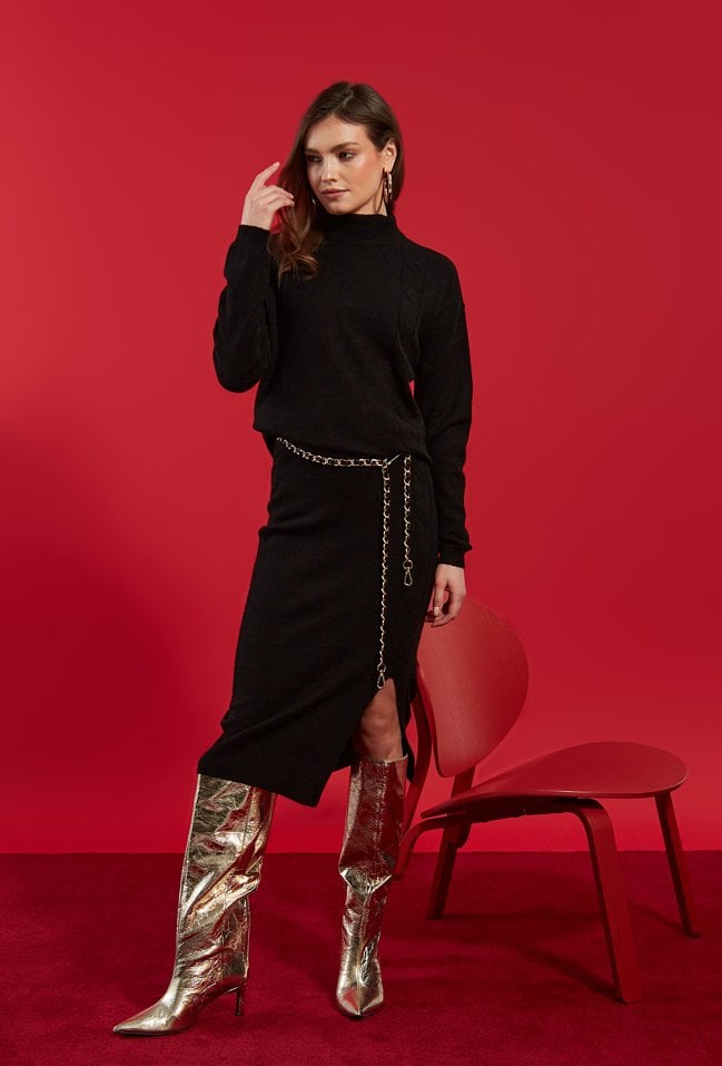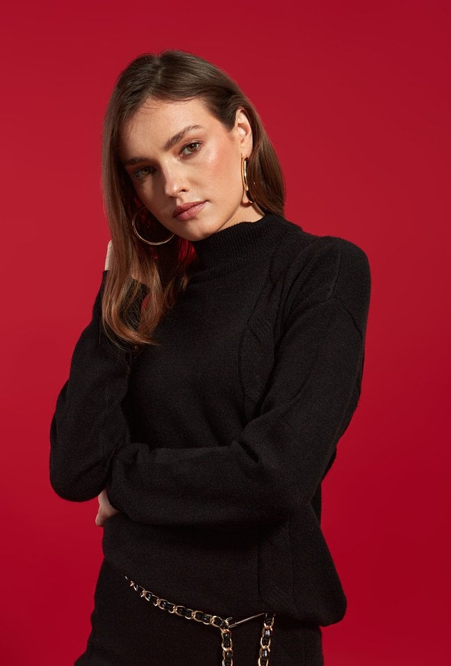 Sweter z półgolfem wykonany z miękkiej dzianiny na bazie wiskozy, z ozdobnym warkoczem. Ma klasyczny czarny kolor, który dobrze komponuje się zarówno z paletą barw nude, jak i klasycznymi kolorami. Sweter występują do kompletu z ołówkowa spódnicą tworząc bardzo kobiecą stylizację. To idealna propozycja do pracy i na wyjścia ze znajomymi dodatkowo dopasowany krój podkreśla sylwetkę. Modelka na zdjęciu ma 175 cm wzrostu i prezentuje rozmiar S.