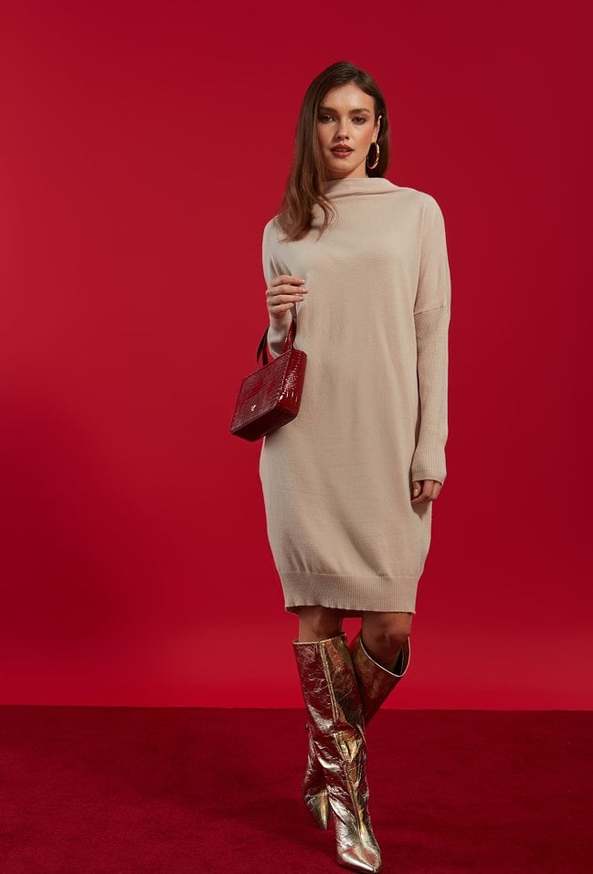 Beżowa sukienka z szerokim golfem wykonana z miękkiej i przyjemnej w dotyku dzianiny z dodatkiem wiskozy . Ma dopasowany fason, długość przed kolana i prezentuje się bardzo kobieco. Będzie doskonałą propozycją na chłodne jesienne dni. Noś ją z kozakami lub szpilkami. Modelka na zdjęciu ma 172 cm wzrostu i prezentuje rozmiar S.