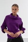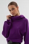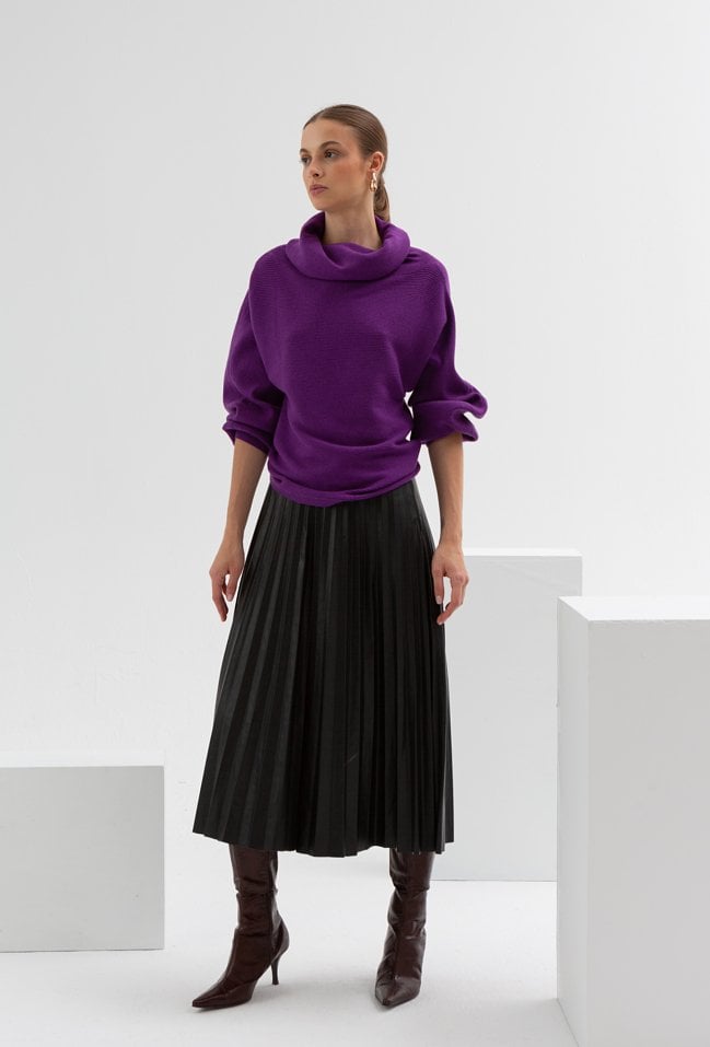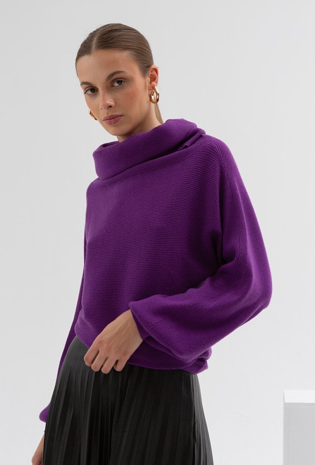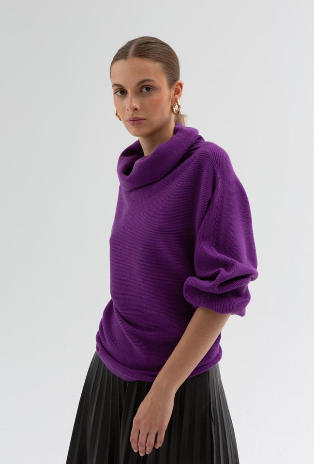 Sweter wykonany z przyjemnej dzianiny o wyrazistym odcieniu fioletu. Zawartość wiskozy zapewnia komfort termiczny w jesienne i zimowe dni. Sweter z szerokim golfem dekoltem posiada delikatnie rozszerzane rękawy zakończone ścigaczem. Ten model będzie pasował na każdy typ sylwetki. Modelka na zdjęciu ma 178 cm wzrostu i prezentuje rozmiar 36.