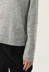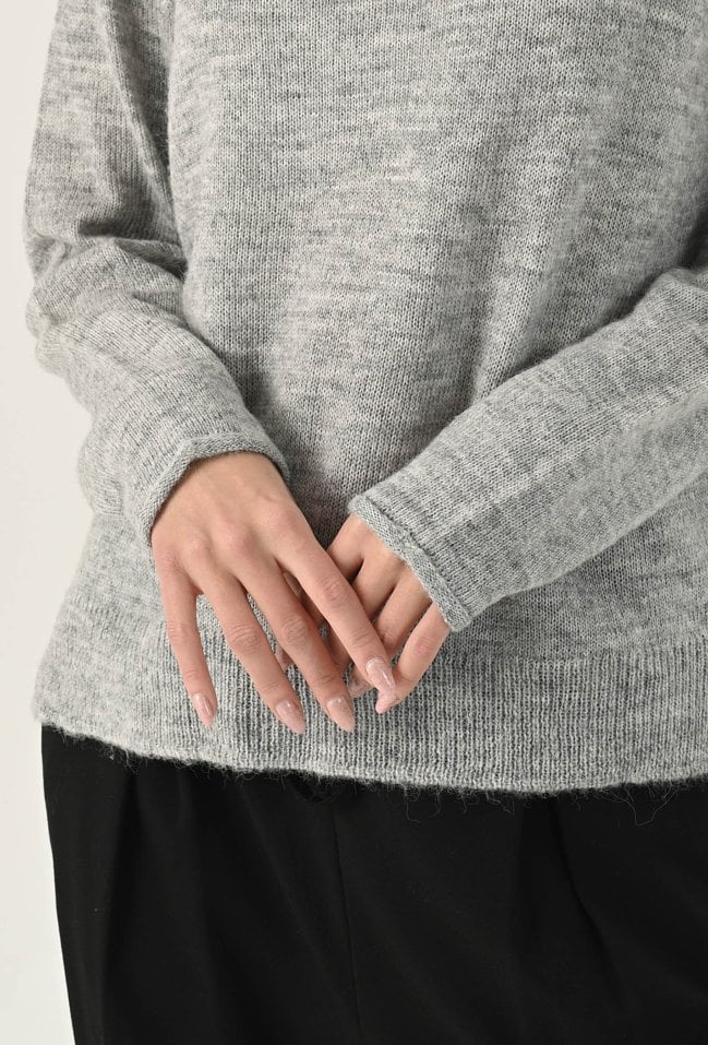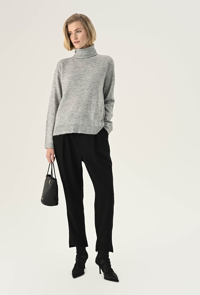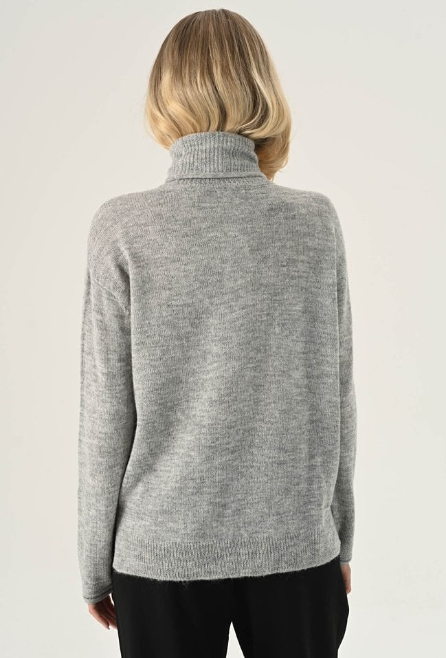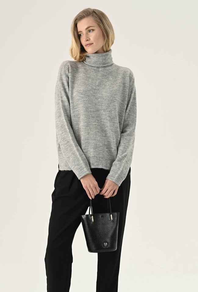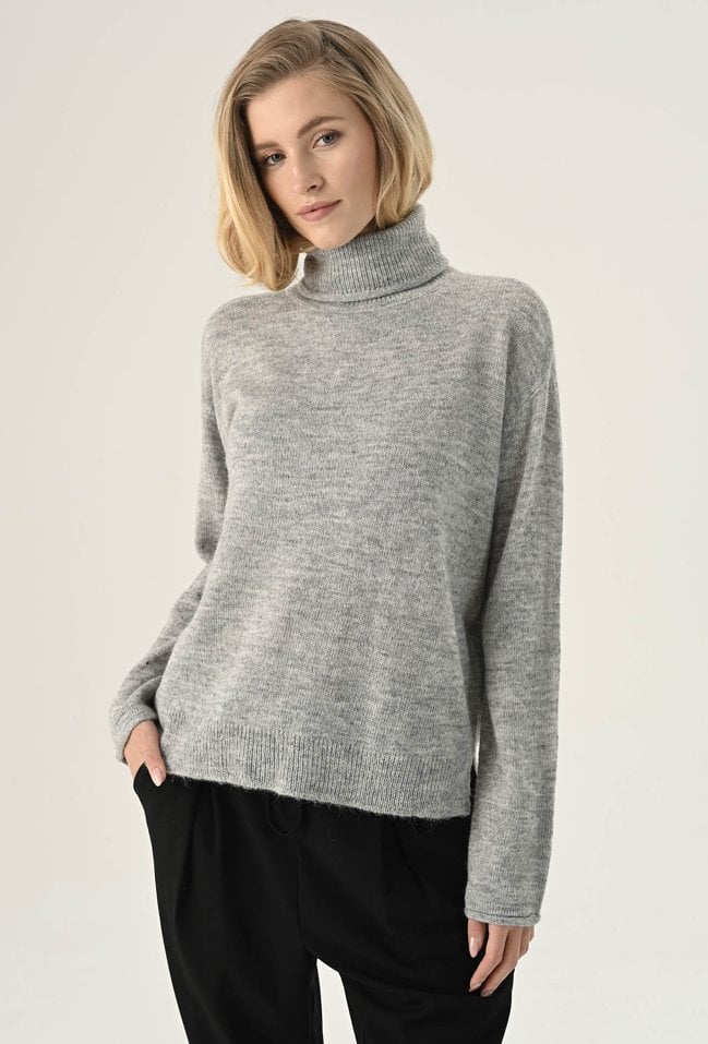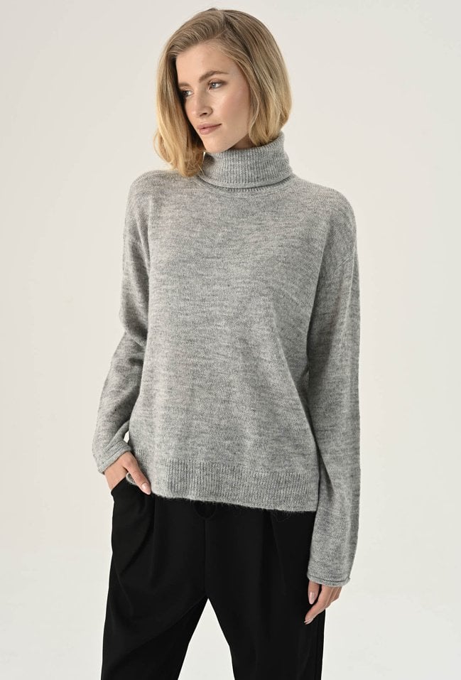 Sweter z golfem w klasycznej szarości. Długie rękawy, opuszczona linia ramion. Ten uniwersalny model, idealnie nadaje się zarówno na jesienno-zimowe chłody, jak również jako okrycie wierzchnie np. na letnie wieczory. To obowiązkowa pozycja w Twojej szafie! Model dostępny w trzech wersjach kolorystycznych. Modelka na zdjęciu ma 175 cm wzrostu i prezentuje rozmiar 36.