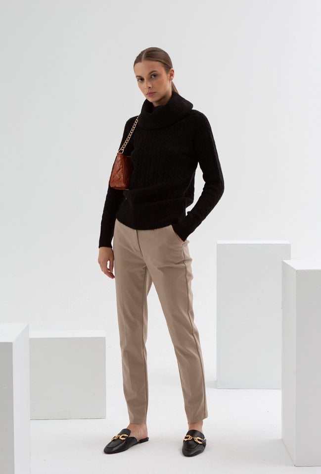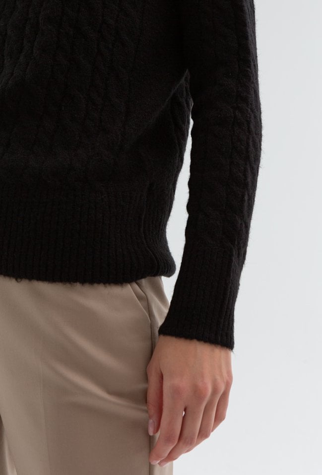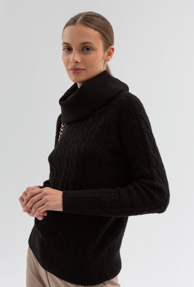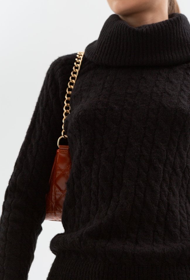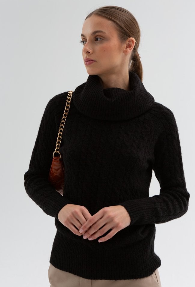 Czarny sweter z szerokim golfem o prostym fasonie wykonany z przyjemniej miękkiej dzianiny. Golf zdobi warkoczowy splot. Długie długie rękawy zakończone ściągaczem. Uniwersalny kolor czyni go doskonałą bazą do jesiennych stylizacji. Modelka na zdjęciu ma 177 cm wzrostu i prezentuje rozmiar 36.