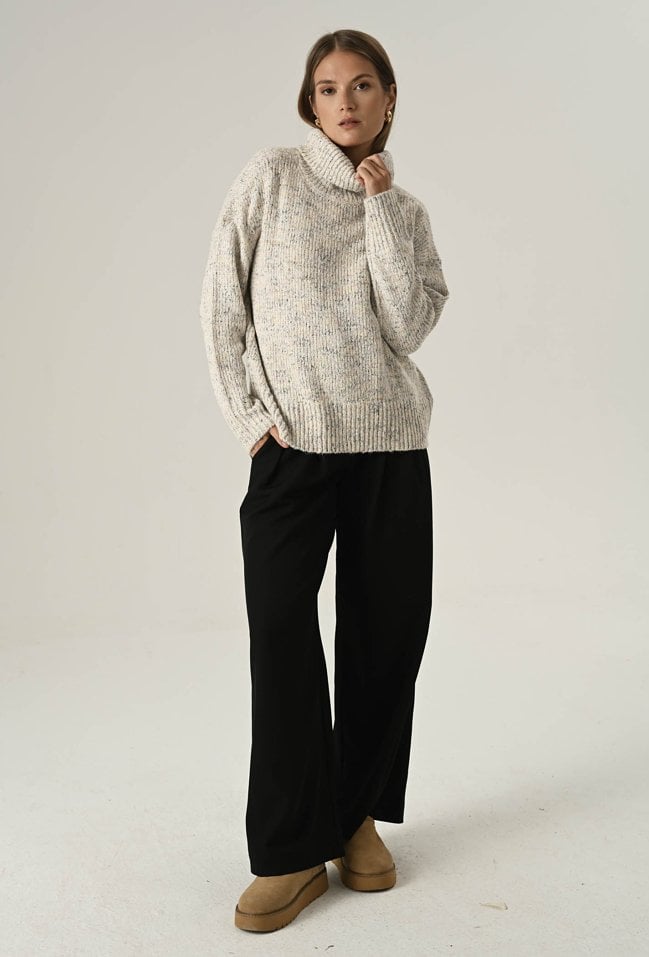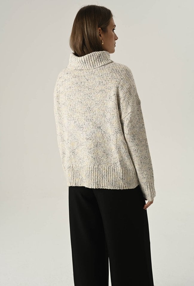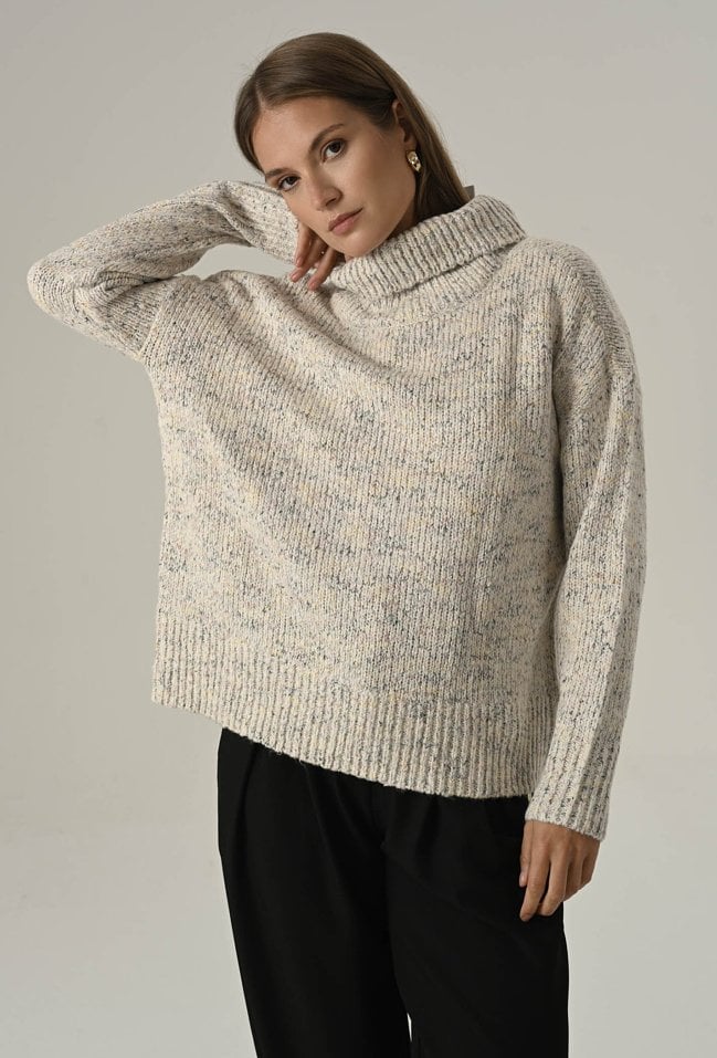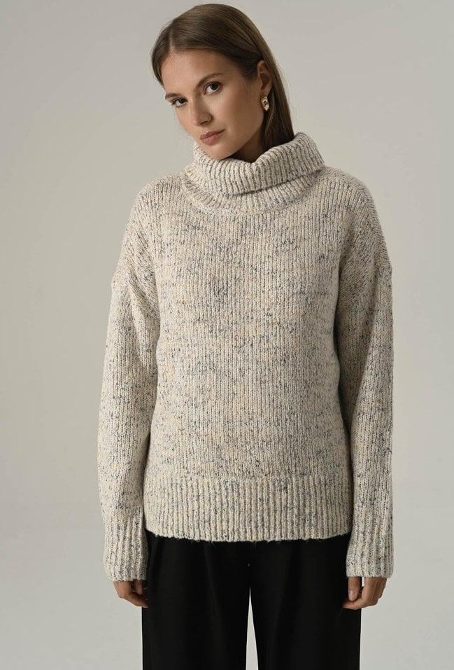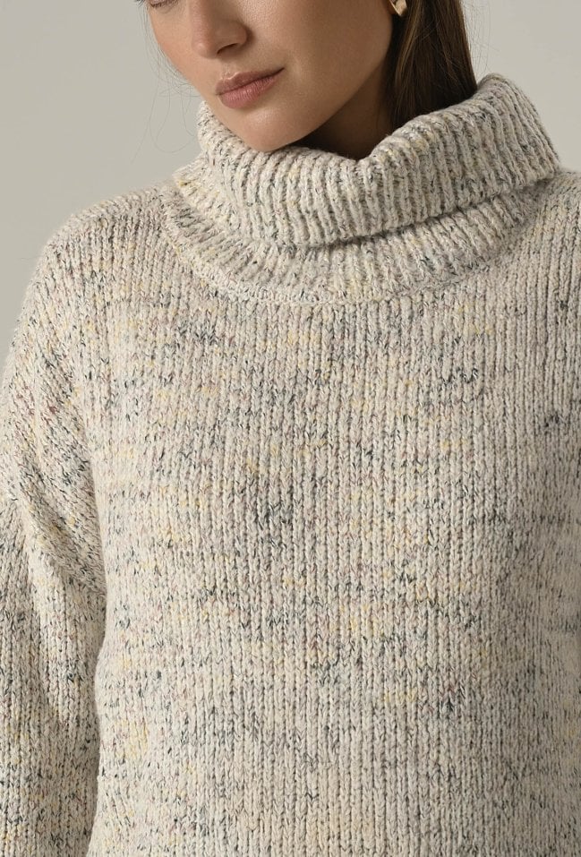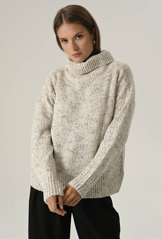 Miękki i przyjemny w dotyku sweter damski o klasycznym kroju, wykonany z efektownej melanżowej przędzy. Duży, otulający golf nie tylko chroni przed chłodem, ale też nadaje całości eleganckiego, swobodnego charakteru. Idealny wybór na zimniejsze dni – zapewnia komfort, ciepło i modny wygląd w jednym. Modelka na zdjęciu ma 177 cm wzrostu i prezentuje rozmiar 36/S.