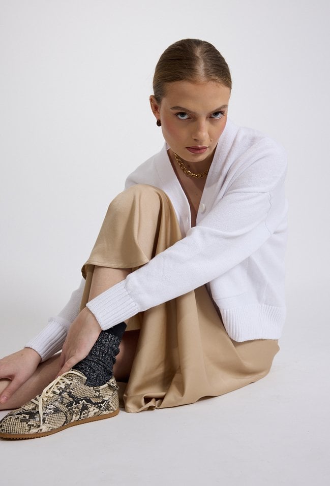 Kardigan damski o swobodnym, komfortowym kroju. Model zapinany na guziki z dekoltem w kształcie litery V oraz długim rękawem. Z przodu znajdują się praktyczne naszywane kieszenie, które podkreślają casualowy charakter modelu. Modelka na zdjęciu ma 177 cm wzrostu i prezentuje rozmiar S.
