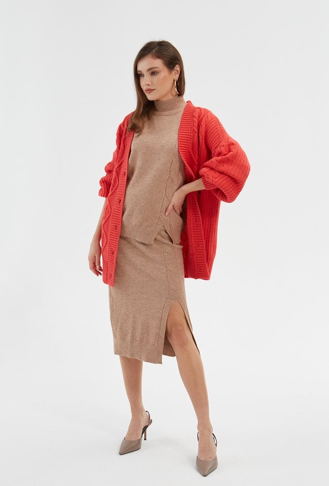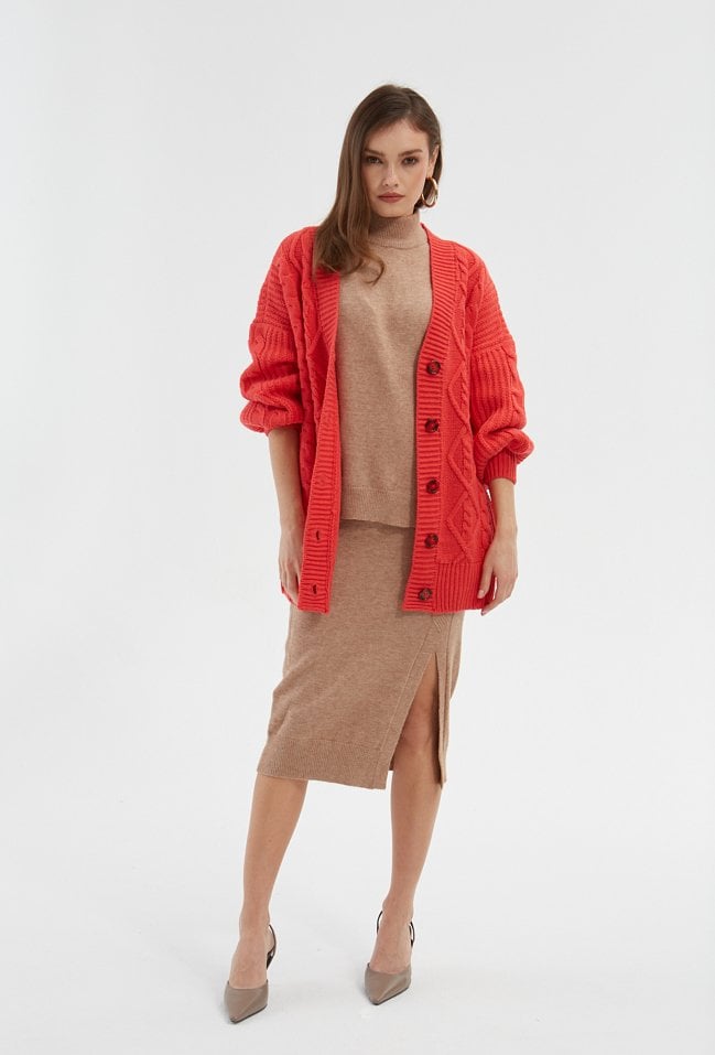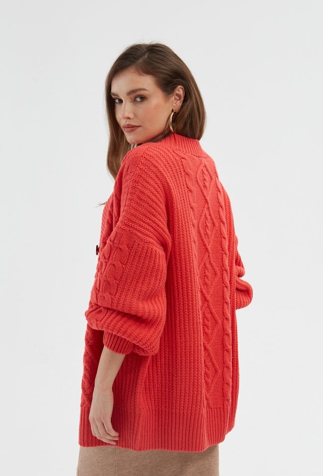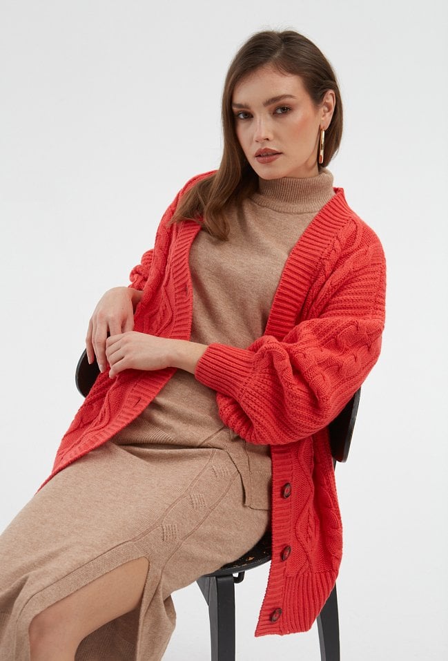 Koralowy kardigan w formie narzutki to doskonałe uzupełnienie stylizacji na chłodne wieczory i zimne dni. Kardigan ma fason do pasa, gruby warkoczowy splot i obniżoną linię ramion, dzięki której prezentuje się doskonale na różnych sylwetkach. Jego rękawy są delikatnie rozszerzane i wygodne, jest zapinany na guziki. Modelka na zdjęciu ma 171 cm wzrostu i prezentuje rozmiar S