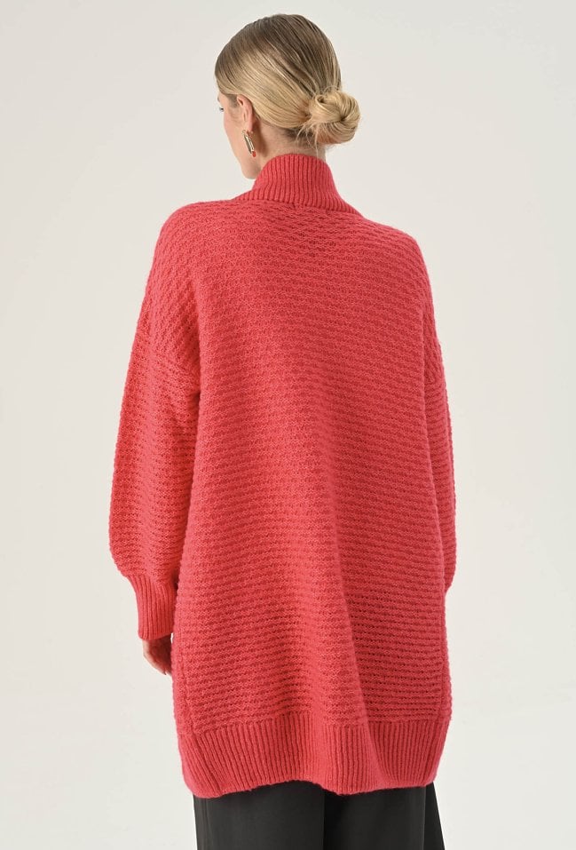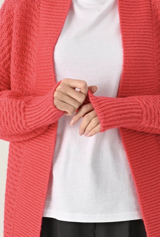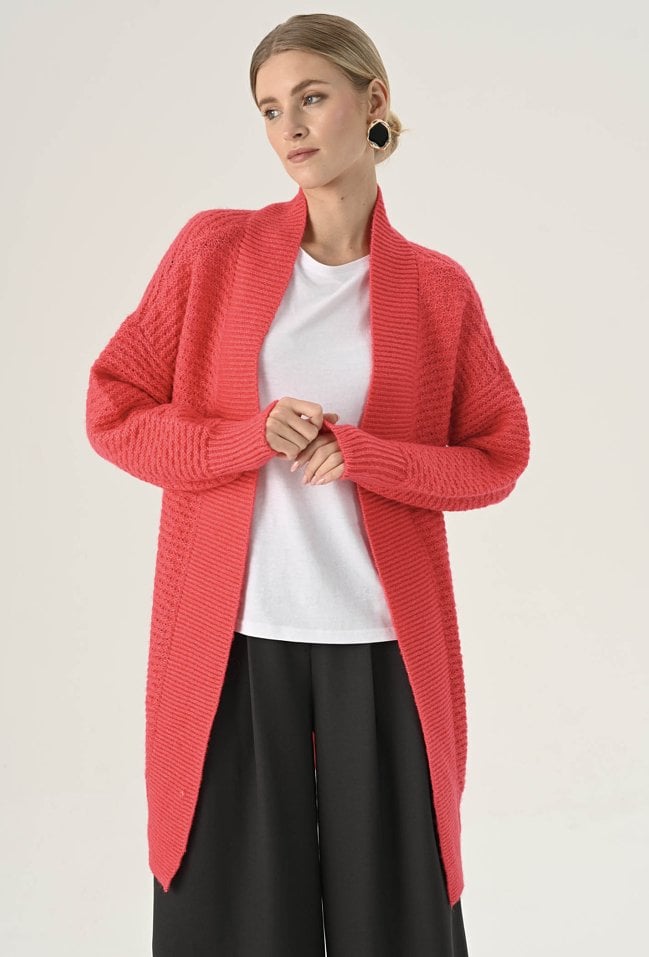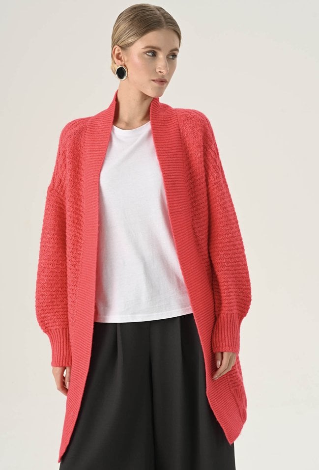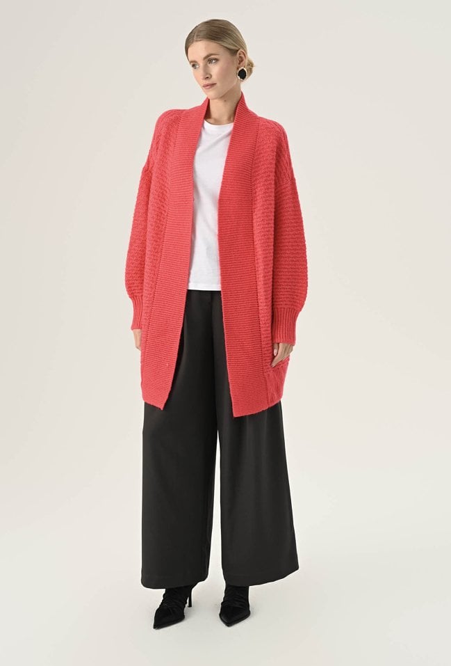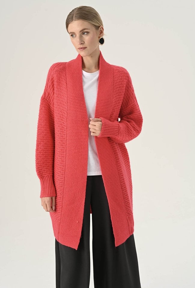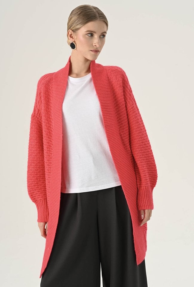 Elegancki, długi kardigan wykonany z miękkiej i przyjemnej w dotyku przędzy z domieszką wełny. Oryginalny, ciekawy splot nadaje mu wyjątkowego charakteru. Idealny na chłodniejsze dni, łączy komfort z ponadczasowym stylem. Modelka na zdjęciu ma 177 cm wzrostu i prezentuje rozmiar 36/S.