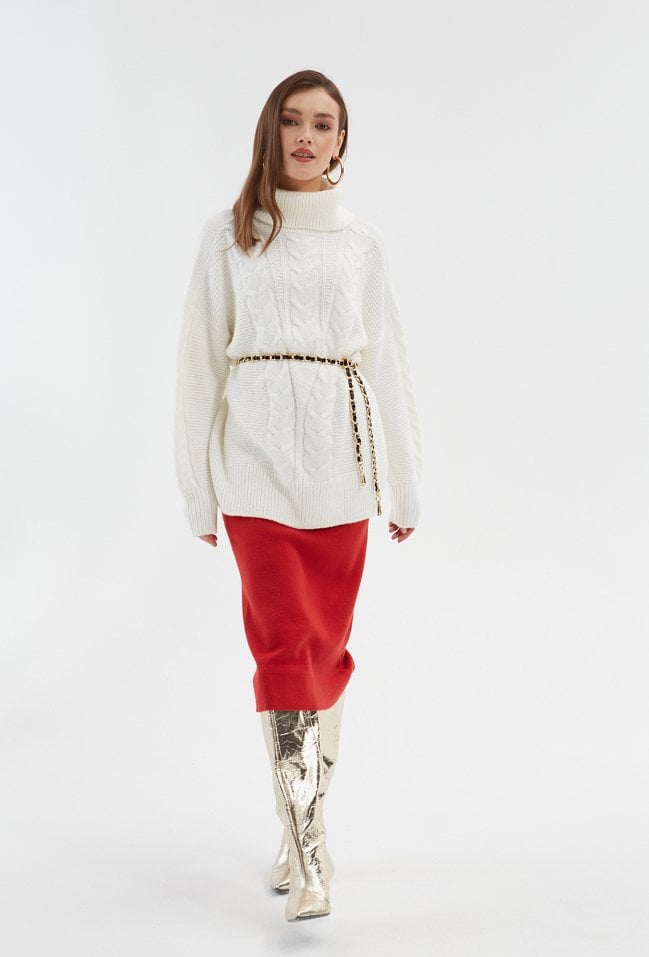 Kremowy ciepły sweter z golfem to jedna z naszych ulubionych zimowych propozycji. Ciepły sweter będzie nas ogrzewał w chłodne zimowe dni. Duży golf, w który będziemy mogły się schować, kiedy tylko zrobi się chłodno. Ozdobny spot poczwarkowy, który nadaje charakteru. Ten model dobrze wygląda z paskiem. Modelka na zdjęciu ma 171 cm wzrostu i prezentuje rozmiar S.