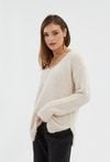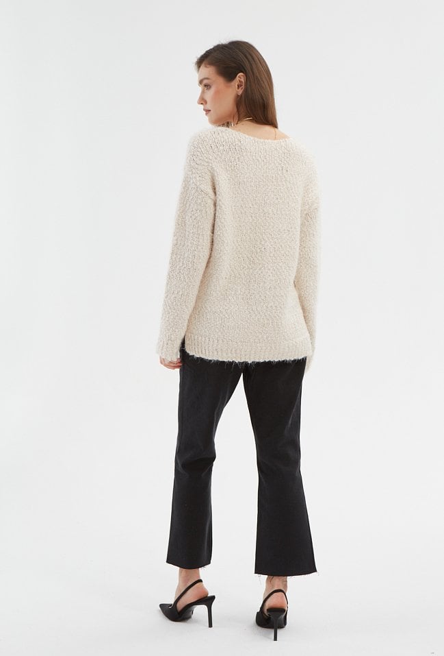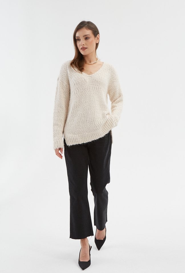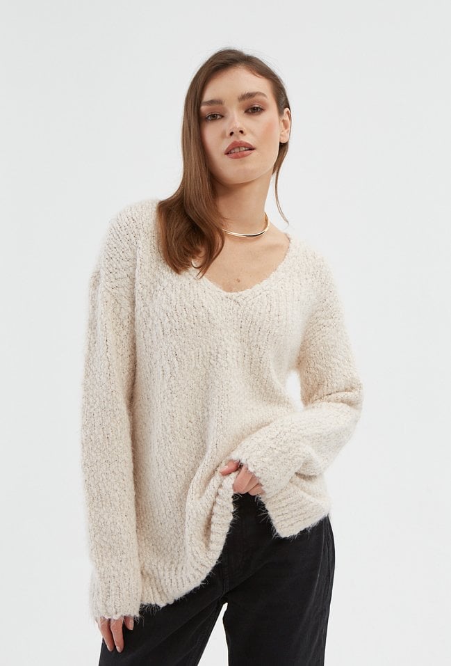 Kremowy sweter z miękkiej przędzy bouclé. Ten model będzie nas ogrzewał całą jesień. Ma luźny fason , długie rękawy z obniżoną linią ramion oraz głęboki dekolt w v-nek. Bardzo mięciutka i przyjemna dzianina, sprawi, że będziemy czuć się bardzo komfortowo. Ten model będzie doskonałym uzupełnieniem jesiennej garderoby a do tego jest bardzo wygodny. Modelka na zdjęciu ma 171 cm wzrostu i prezentuje rozmiar S.