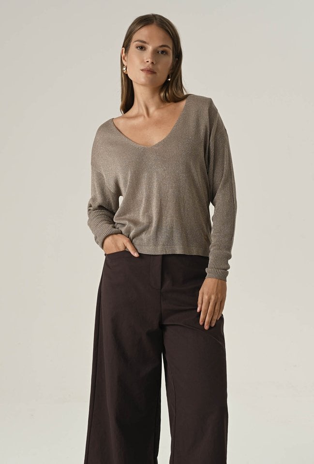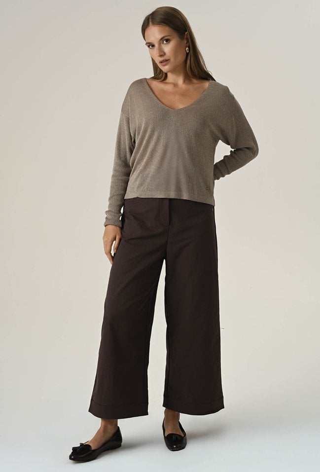 Ten sweter to doskonałe połączenie komfortu i modowego wyczucia. Wykonany z lekkiej dzianiny z przewagą wiskozy, jest przyjemny dla skóry i pięknie się układa. Dekolt w literę V subtelnie wysmukla sylwetkę, a łączone faktury dodają całości nowoczesnego charakteru. Długi rękaw sprawia, że to idealny model na sezon przejściowy. Modelka na zdjęciu ma 177 cm wzrostu i prezentuje rozmiar 36/S.