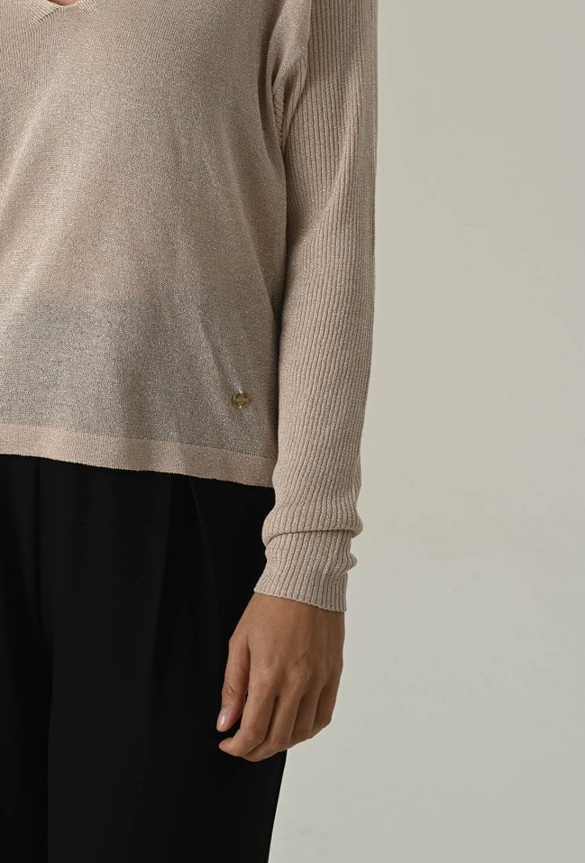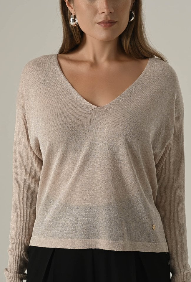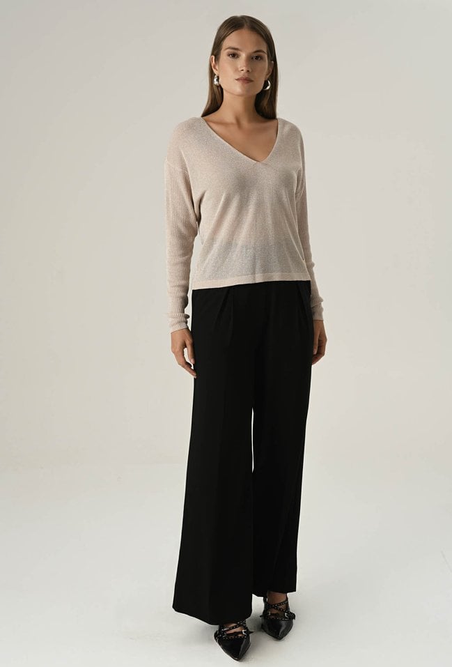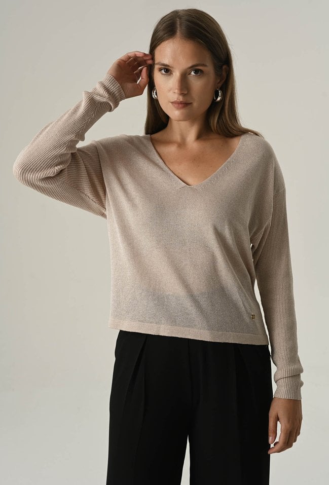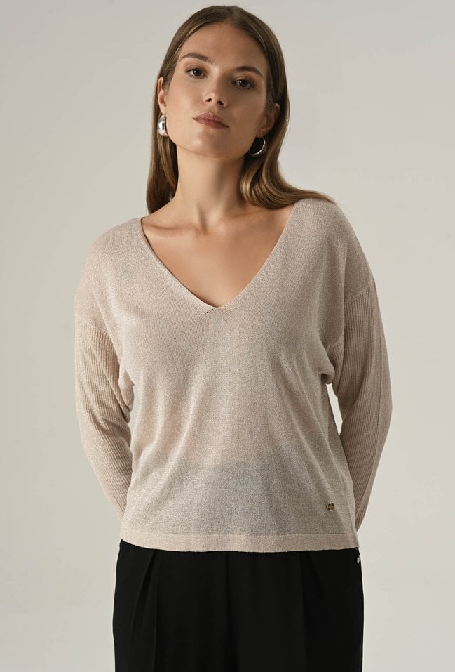 Ten sweter to doskonałe połączenie komfortu i modowego wyczucia. Wykonany z lekkiej dzianiny z przewagą wiskozy, jest przyjemny dla skóry i pięknie się układa. Dekolt w literę V subtelnie wysmukla sylwetkę, a łączone faktury dodają całości nowoczesnego charakteru. Długi rękaw sprawia, że to idealny model na sezon przejściowy. Modelka na zdjęciu ma 177 cm wzrostu i prezentuje rozmiar 36/S.