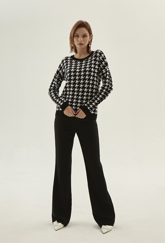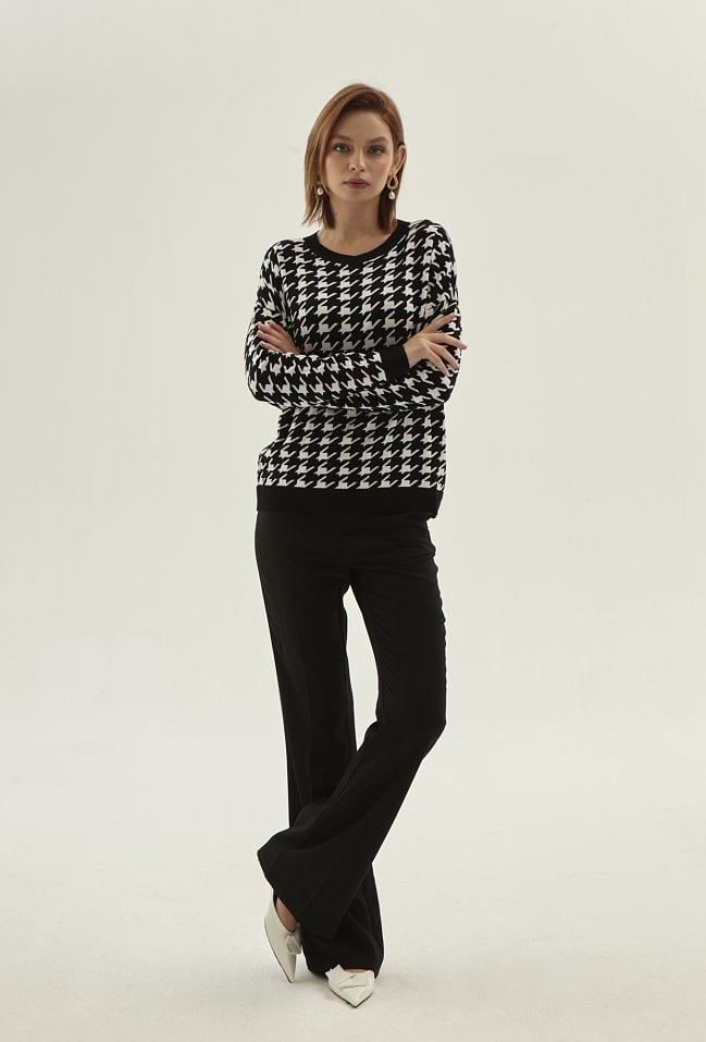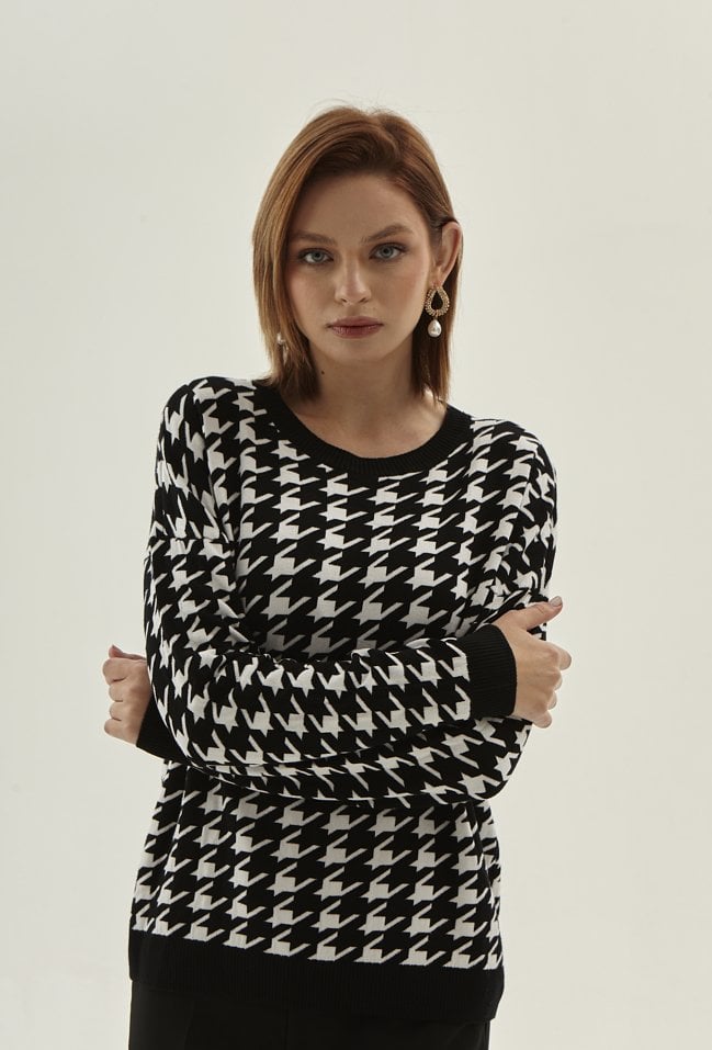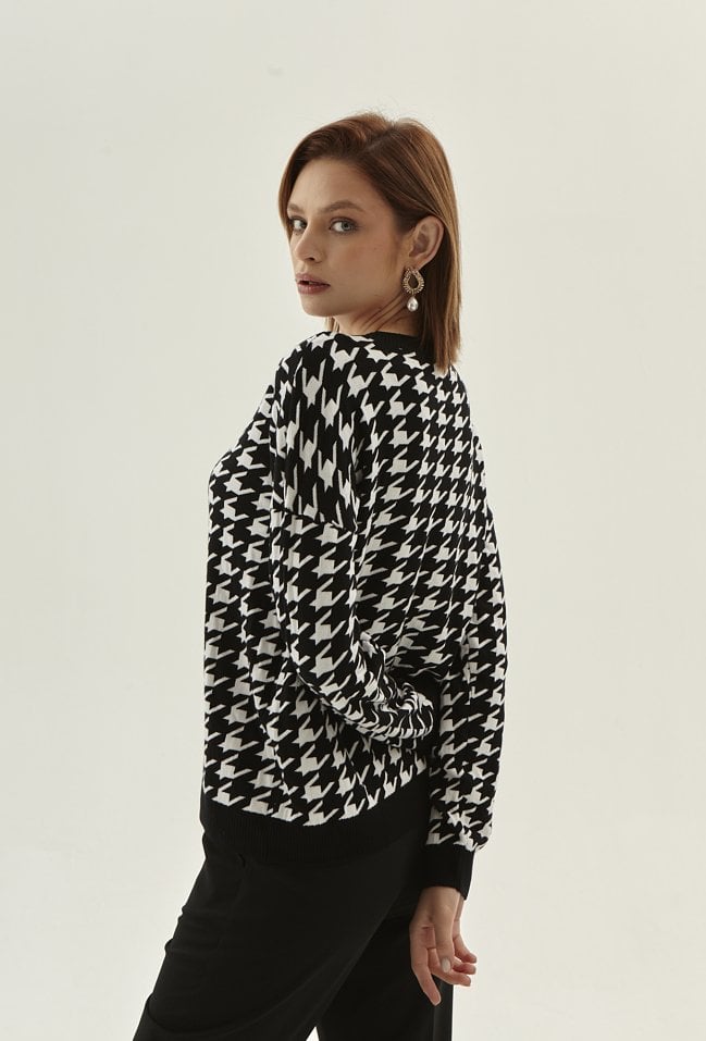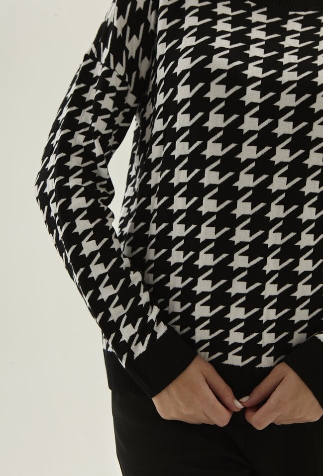 Sweter o luźnym fasonie w pepitkę wykony z przyjemnej w dotyku wiskozy. Długie rękawy, opuszczona linia ramion oraz okrągły dekolt. Występuję w komplecie ze spódnicą. To świetna propozycja na jesienne wyjścia nie tylko będzie Cię ogrzewać w jesienne chłody ale sprawi , ze będziesz wyglądała pięknie. Modelka na zdjęciu ma 177 cm wzrostu i prezentuje