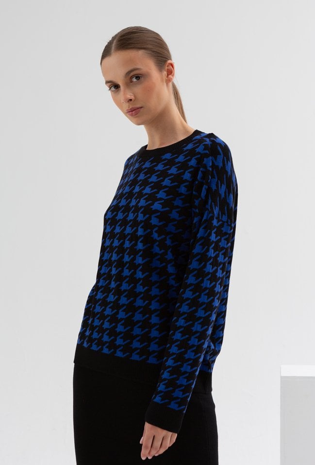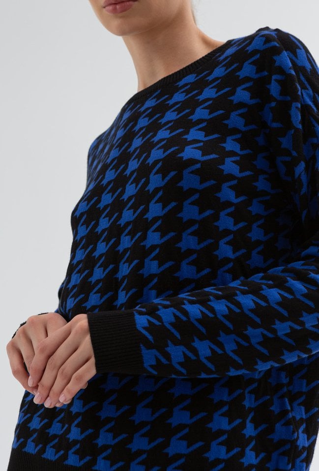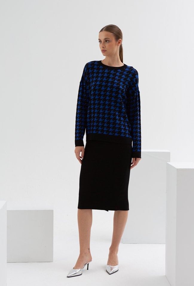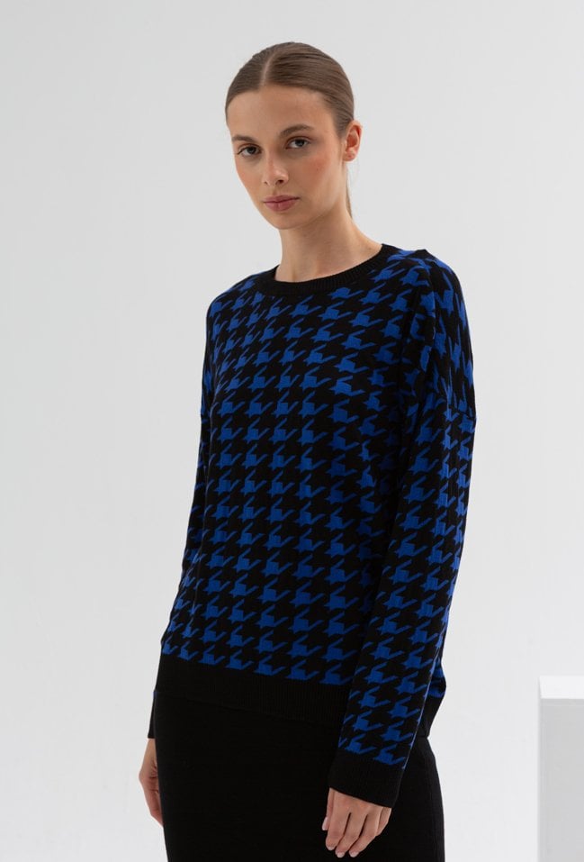 Sweter o luźnym fasonie w pepitkę wykony z przyjemnej w dotyku wiskozy. Długie rękawy, opuszczona linia ramion oraz okrągły dekolt. Występuję w komplecie ze spódnicą. To świetna propozycja na jesienne wyjścia nie tylko będzie Cię ogrzewać w jesienne chłody ale sprawi , ze będziesz wyglądała pięknie. Modelka na zdjęciu ma 177 cm wzrostu i prezentuje