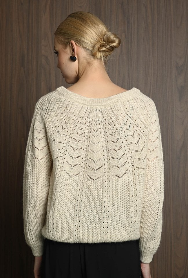 Miękki sweter z domieszką wełny, który łączy wygodę z oryginalnym wzorem dzianiny. Dekolt w łódkę nadaje swetrowi subtelny i klasyczny wygląd, podkreślając kobiecy styl. Idealny na co dzień i do bardziej wyjściowych stylizacji. Modelka na zdjęciu ma 177 cm wzrostu i prezentuje rozmiar 36.
