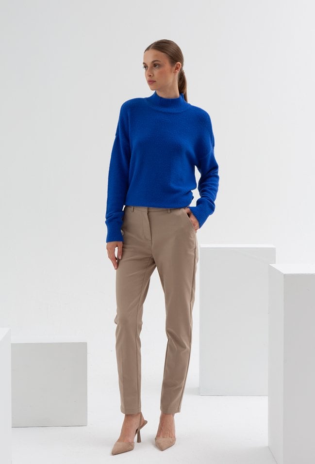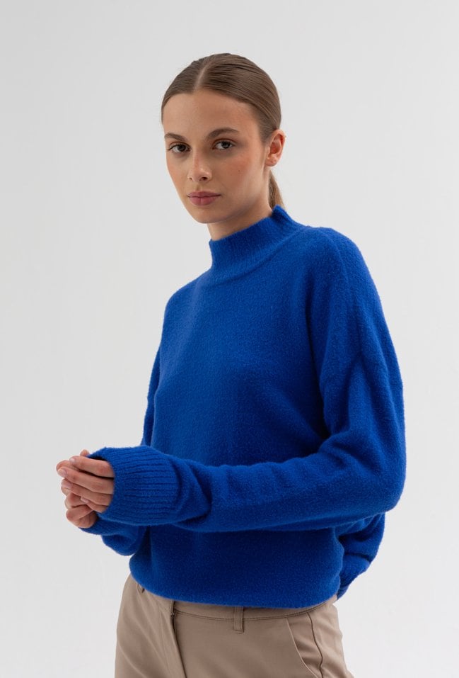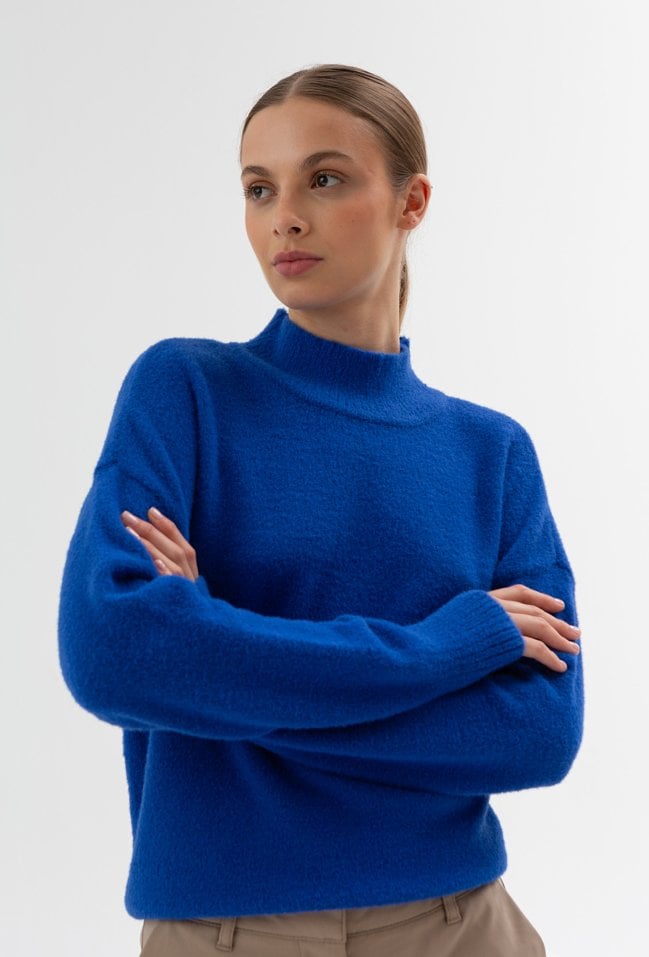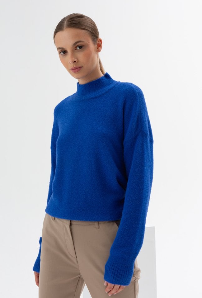 Sweter w pięknym kobaltowym kolorze, został wykonany z miękkiej, przyjemnej dzianiny.Ma delikatnie oversize'owy fason , obniżona linie ramion to czyni go bardzo uniwersalnym. Sweterek z golfem w sprawdzi się do codziennych do tego będzie nas ogrzewał clą jesień i zimę. Modelka na zdjęciu ma 180 cm wzrostu i prezentuje rozmiar 36.