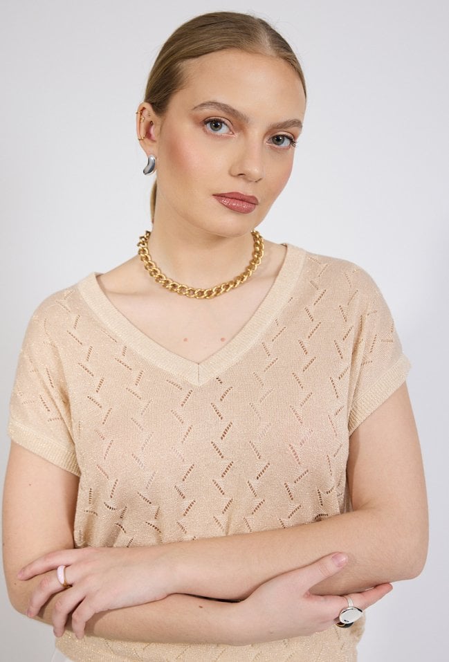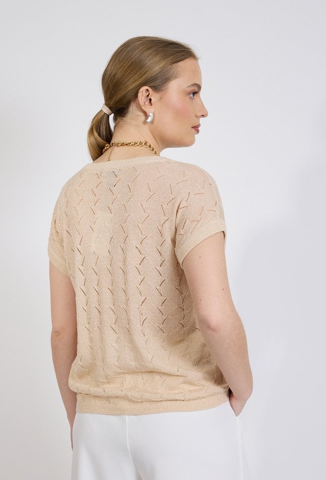 Sweter damski o lekkim, swobodnym kroju. Model z krótkim, luźnym rękawem oraz dekoltem w kształcie litery V, który subtelnie podkreśla linię szyi. Całość zdobi delikatny, ażurowy wzór o geometrycznym charakterze, nadający swetrowi lekkości i dekoracyjnego wyglądu. Modelka na zdjęciu ma 177 cm wzrostu i prezentuje rozmiar S.