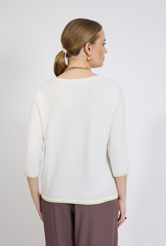 Sweter damski o dopasowanym, wygodnym kroju. Model z rękawem o długości 3/4 oraz dekoltem w kształcie litery V, który subtelnie podkreśla linię szyi. Delikatna, prążkowana struktura materiału nadaje całości lekkości, a ozdobne wiązanie u dołu stanowi ciekawy, kobiecy akcent. Modelka na zdjęciu ma 177 cm wzrostu i prezentuje rozmiar S.
