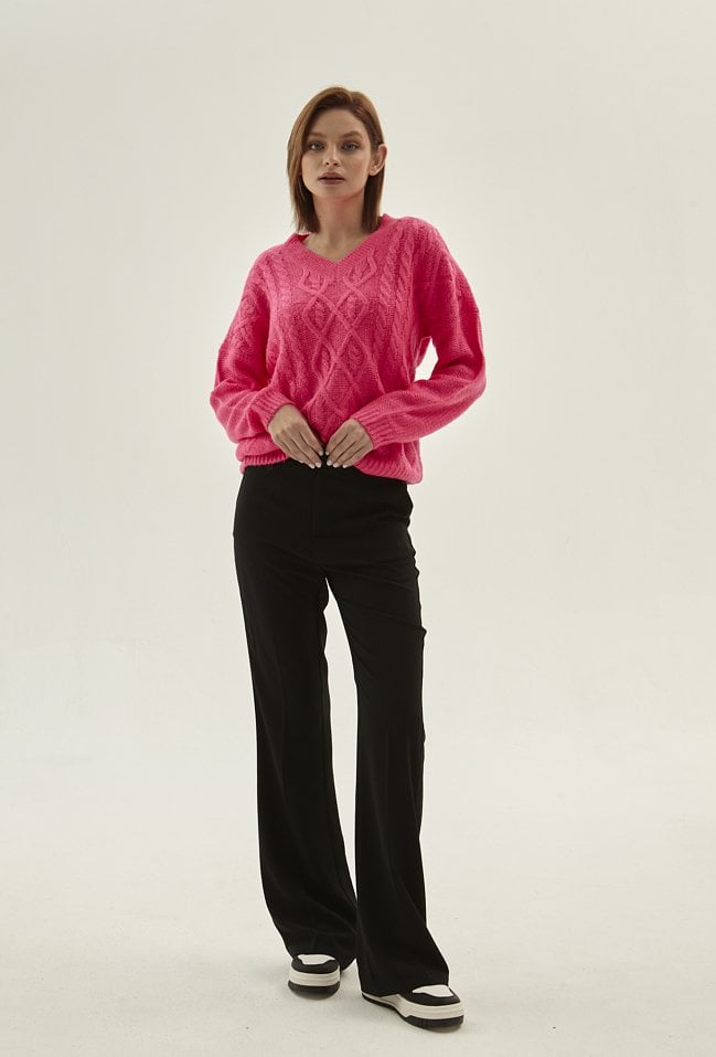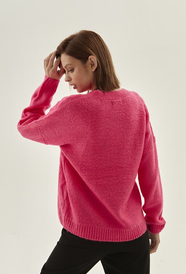 Sweter w kolorze soczystego różu z warkoczowym splotem, to idealna propozycja do codziennych, jesiennych stylizacji. Sweter z długimi rękawami oraz dekoltem w V-nek, brzegi wykończone ściągaczem. Modelka na zdjęciu ma 175 cm wzrostu i prezentuje rozmiar S.