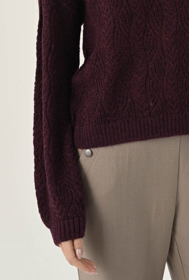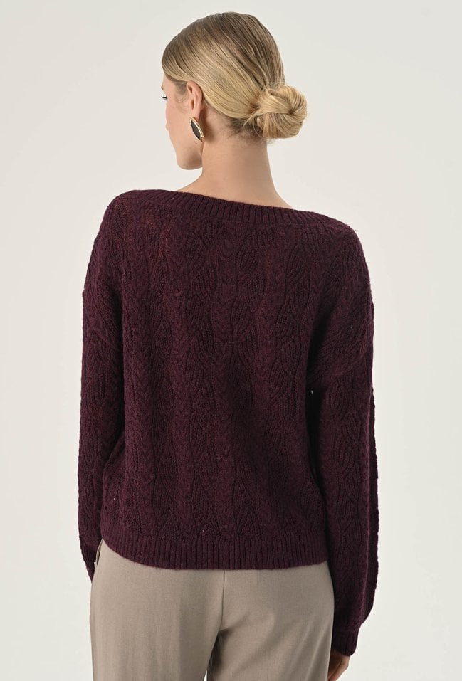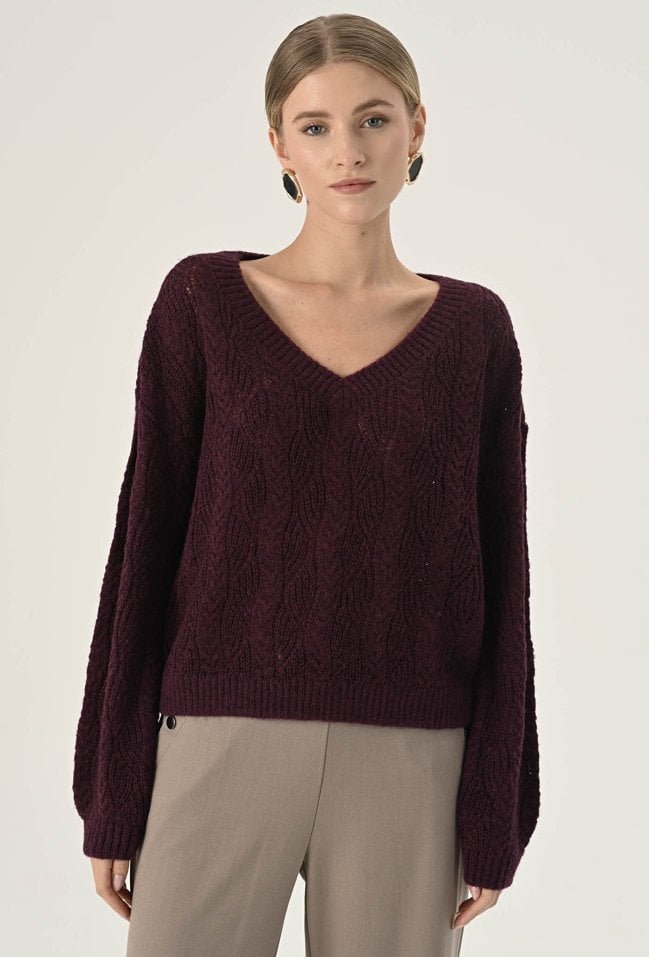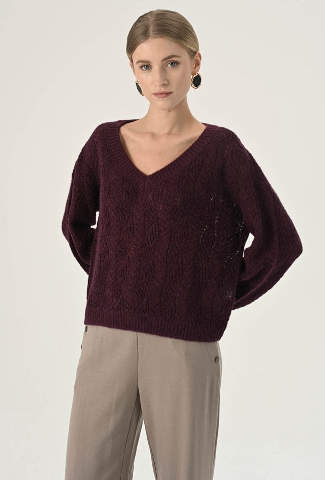 Stylowy sweter wykonany z miękkiej dzianiny z domieszką wełny. Dekolt w kształcie litery V oraz oryginalna struktura splotu nadaje całości wyjątkowego charakteru. Komfortowy, kobiecy fason idealny zarówno na co dzień, jak i do bardziej eleganckich stylizacji. Modelka na zdjęciu ma 177 cm wzrostu i prezentuje rozmiar S.