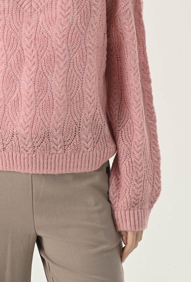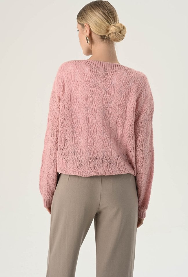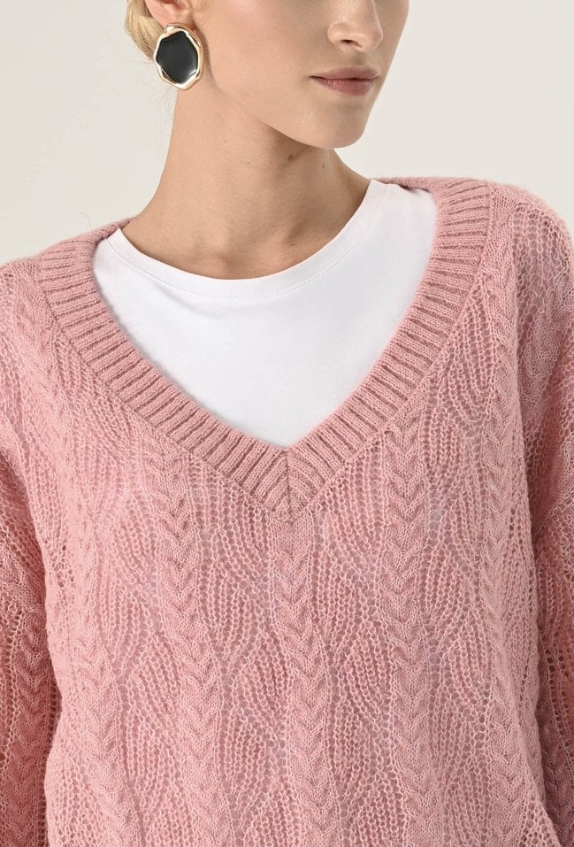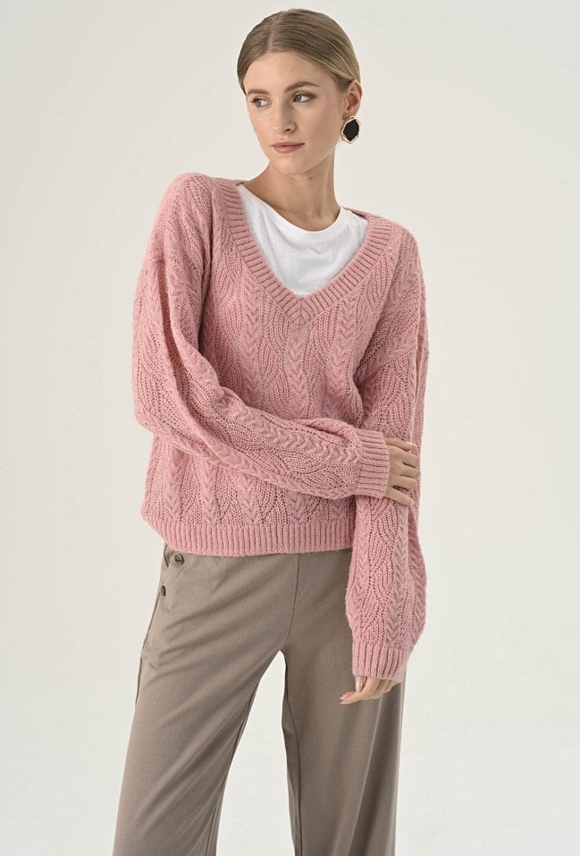 Stylowy sweter wykonany z miękkiej dzianiny z domieszką wełny. Dekolt w kształcie litery V oraz oryginalna struktura splotu nadaje całości wyjątkowego charakteru. Komfortowy, kobiecy fason idealny zarówno na co dzień, jak i do bardziej eleganckich stylizacji. Modelka na zdjęciu ma 177 cm wzrostu i prezentuje rozmiar S.