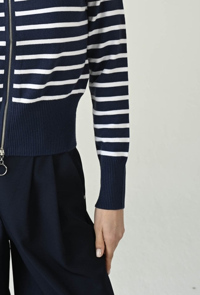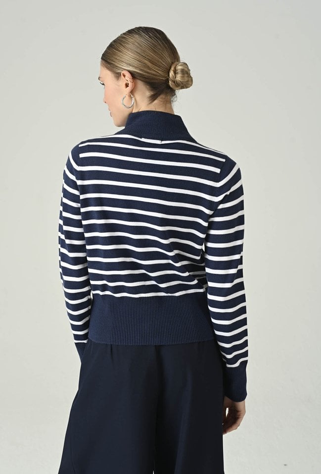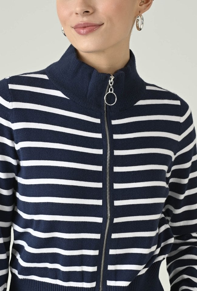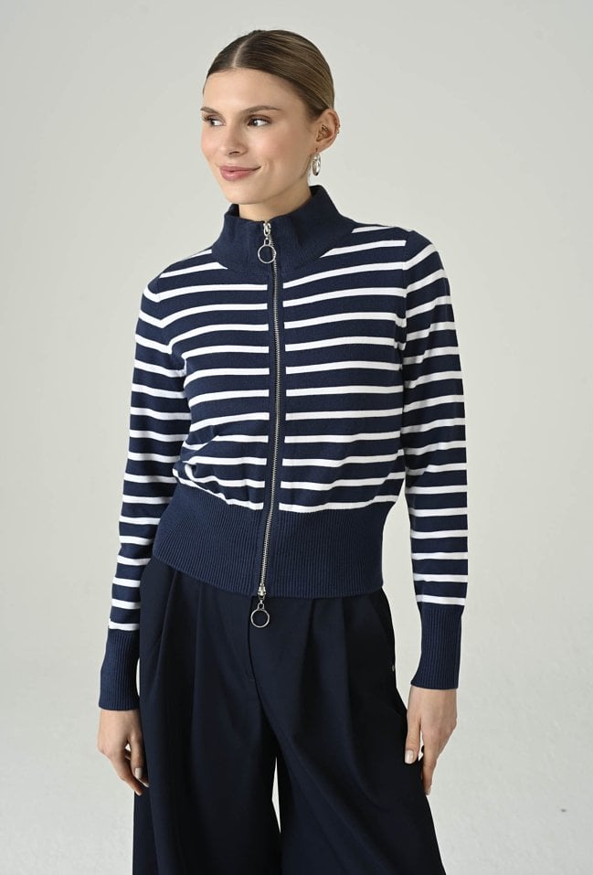 Stylowy sweter w paski wykonany z miękkiej dzianiny z dodatkiem wiskozy, który łączy komfort z modnym designem. Długi rękaw i stójka pod szyję zapewniają ciepło i wygodę, a zapinanie na dwustronny zamek daje możliwość dowolnego dopasowania stylu. Idealny do codziennych i casualowych zestawów, nadając im nowoczesnego charakteru.