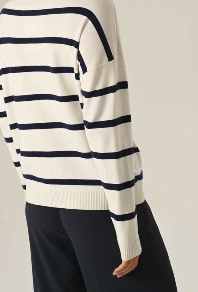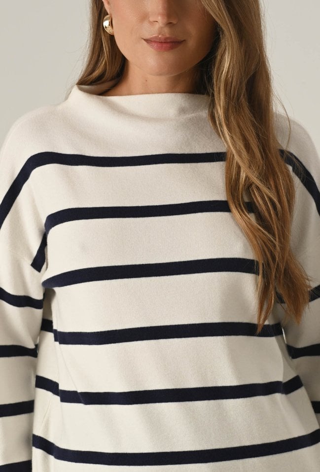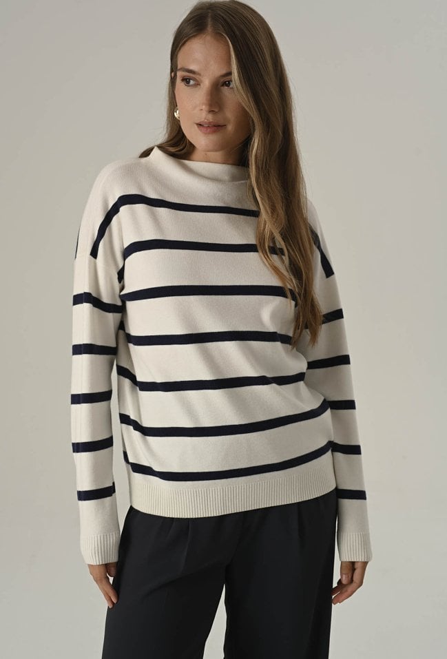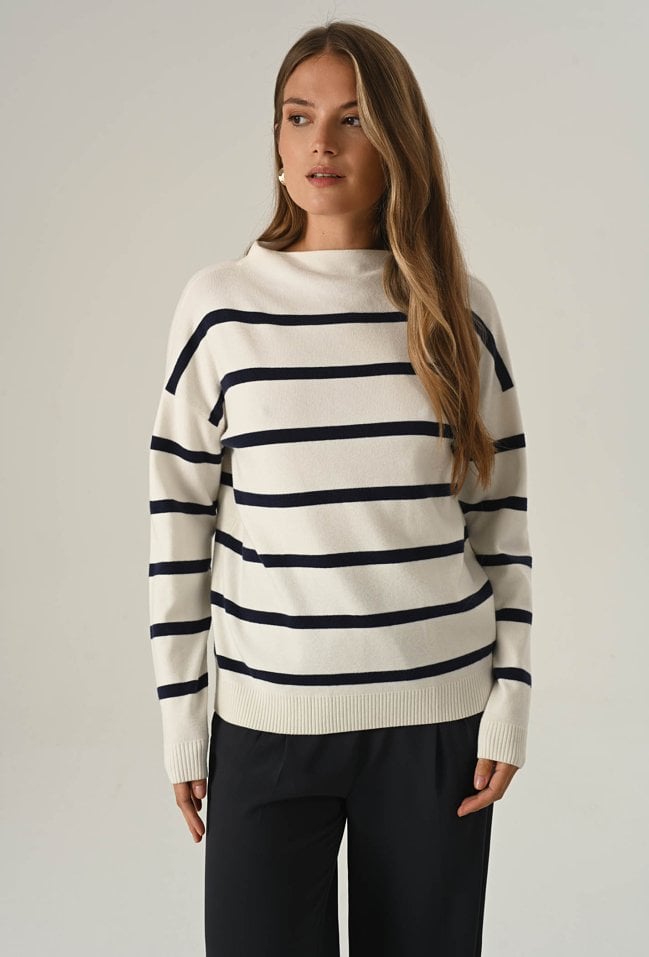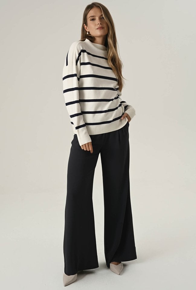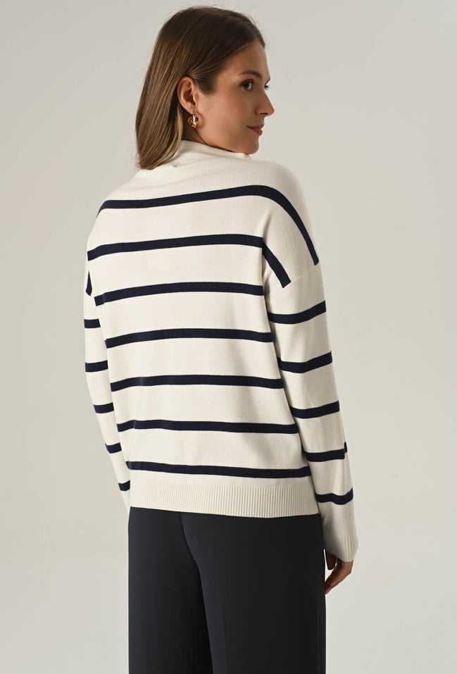 Stylowy sweter damski wykonany z miękkiej, przyjemnej w dotyku przędzy. Klasyczny wzór w paski w połączeniu ze stójką nadaje całości eleganckiego, a zarazem nowoczesnego charakteru. Fason świetnie układa się na sylwetce i sprawdzi się zarówno w codziennych, jak i bardziej formalnych stylizacjach. Modelka na zdjęciu ma 177 cm wzrostu i prezentuje rozmiar 36/S.