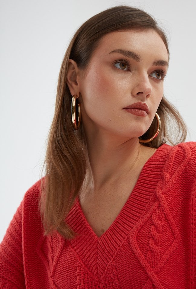 Koralowy sweter wykonany z przyjemnej dzianiny. To doskonałe uzupełnienie stylizacji na chłodne wieczory i zimne dni. Sweter ma fason do pasa, gruby warkoczowy splot i obniżoną linię ramion, dzięki której prezentuje się doskonale na różnych sylwetkach. Jego rękawy są delikatnie rozszerzane i wygodne, ma głeboki dekolt w v-nek. Modelka na zdjęciu ma 171 cm wzrostu i prezentuje rozmiar S