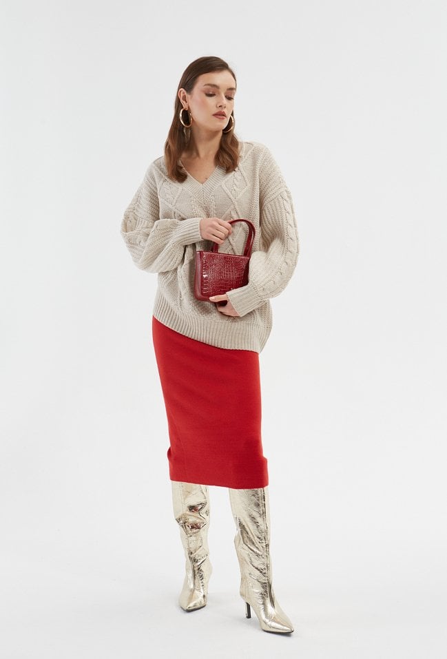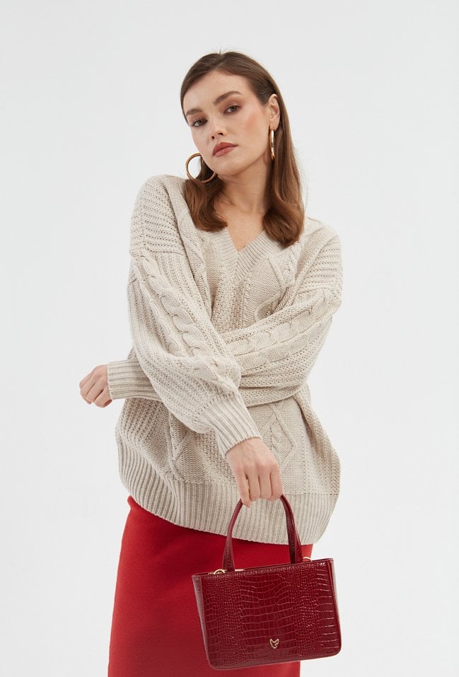 Sweter w kolorze kości słoniowej wykonany z przyjemnej dzianiny. To doskonałe uzupełnienie stylizacji na chłodne wieczory i zimne dni. Sweter ma fason do pasa, gruby warkoczowy splot i obniżoną linię ramion, dzięki której prezentuje się doskonale na różnych sylwetkach. Jego rękawy są delikatnie rozszerzane i wygodne, ma głeboki dekolt w v-nek. Modelka na zdjęciu ma 171 cm wzrostu i prezentuje rozmiar S