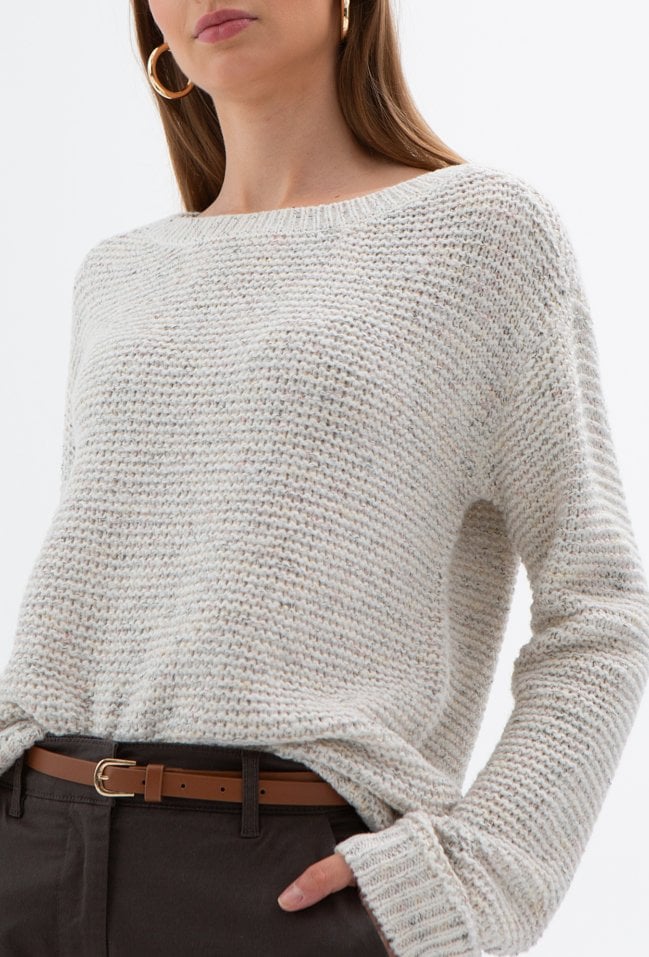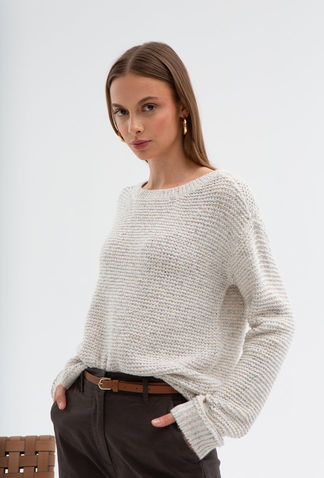 Beżowy sweter o prostym fasonie z kolorową włóczka. Długie rękawy, okrągły dekolt zakończony sięgaczem. Uroku dodaje mu ciekawy splot. Ten uniwersalny model, idealnie nadaje się zarówno na jesienno-zimowe chłody, jak również jako okrycie wierzchnie np. na letnie wieczory. Modelka na zdjęciu ma 178 cm wzrostu i prezentuje rozmiar 36.