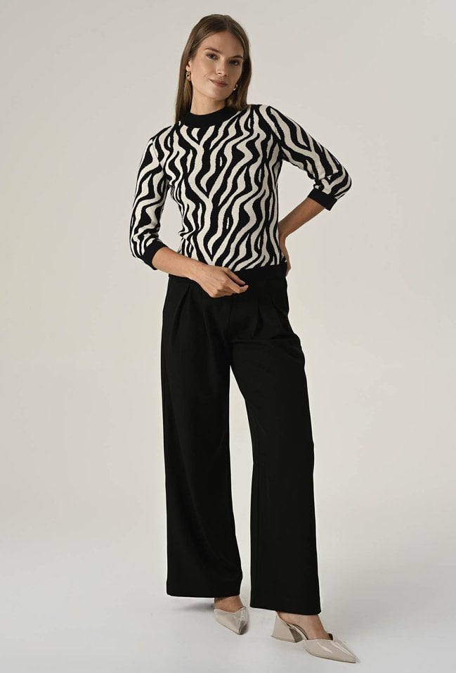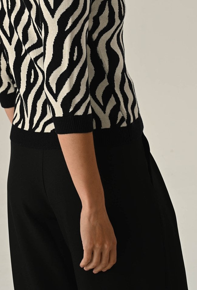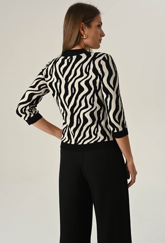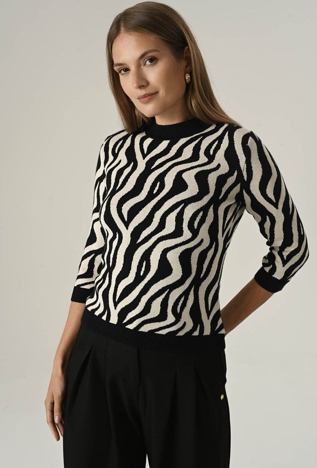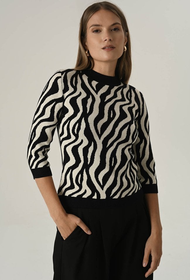 Postaw na modę i wygodę! Nasz sweter z miękkiej dzianiny z wysoką zawartością wiskozy zachwyca unikalnym printem oraz oryginalnym, półokrągłym dekoltem. Rękawy do łokcia dodają lekkości i idealnie sprawdzą się w cieplejsze dni. To must-have w Twojej garderobie, który podkreśli Twój styl i doda charakteru każdej stylizacji! Modelka na zdjęciu ma 177 cm wzrostu i prezentuje rozmiar 36/S.